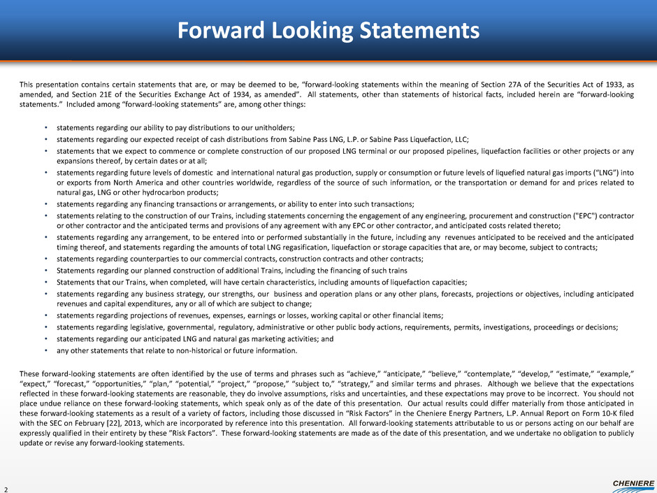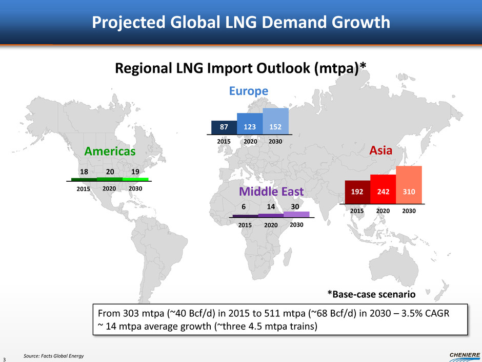 Forward Looking Statements 2 This presentation contains certain statements that are, or may be deemed to be, “forward-looking statements within the meaning of Section 27A of the Securities Act of 1933, as amended, and Section 21E of the Securities Exchange Act of 1934, as amended”. All statements, other than statements of historical facts, included herein are “forward-looking statements.” Included among “forward-looking statements” are, among other things: • statements regarding our ability to pay distributions to our unitholders; • statements regarding our expected receipt of cash distributions from Sabine Pass LNG, L.P. or Sabine Pass Liquefaction, LLC; • statements that we expect to commence or complete construction of our proposed LNG terminal or our proposed pipelines, liquefaction facilities or other projects or any expansions thereof, by certain dates or at all; • statements regarding future levels of domestic and international natural gas production, supply or consumption or future levels of liquefied natural gas imports (“LNG”) into or exports from North America and other countries worldwide, regardless of the source of such information, or the transportation or demand for and prices related to natural gas, LNG or other hydrocarbon products; • statements regarding any financing transactions or arrangements, or ability to enter into such transactions; • statements relating to the construction of our Trains, including statements concerning the engagement of any engineering, procurement and construction ("EPC") contractor or other contractor and the anticipated terms and provisions of any agreement with any EPC or other contractor, and anticipated costs related thereto; • statements regarding any arrangement, to be entered into or performed substantially in the future, including any revenues anticipated to be received and the anticipated timing thereof, and statements regarding the amounts of total LNG regasification, liquefaction or storage capacities that are, or may become, subject to contracts; • statements regarding counterparties to our commercial contracts, construction contracts and other contracts; • Statements regarding our planned construction of additional Trains, including the financing of such trains • Statements that our Trains, when completed, will have certain characteristics, including amounts of liquefaction capacities; • statements regarding any business strategy, our strengths, our business and operation plans or any other plans, forecasts, projections or objectives, including anticipated revenues and capital expenditures, any or all of which are subject to change; • statements regarding projections of revenues, expenses, earnings or losses, working capital or other financial items; • statements regarding legislative, governmental, regulatory, administrative or other public body actions, requirements, permits, investigations, proceedings or decisions; • statements regarding our anticipated LNG and natural gas marketing activities; and • any other statements that relate to non-historical or future information. These forward-looking statements are often identified by the use of terms and phrases such as “achieve,” “anticipate,” “believe,” “contemplate,” “develop,” “estimate,” “example,” “expect,” “forecast,” “opportunities,” “plan,” “potential,” “project,” “propose,” “subject to,” “strategy,” and similar terms and phrases. Although we believe that the expectations reflected in these forward-looking statements are reasonable, they do involve assumptions, risks and uncertainties, and these expectations may prove to be incorrect. You should not place undue reliance on these forward-looking statements, which speak only as of the date of this presentation. Our actual results could differ materially from those anticipated in these forward-looking statements as a result of a variety of factors, including those discussed in “Risk Factors” in the Cheniere Energy Partners, L.P. Annual Report on Form 10-K filed with the SEC on February [22], 2013, which are incorporated by reference into this presentation. All forward-looking statements attributable to us or persons acting on our behalf are expressly qualified in their entirety by these ”Risk Factors”. These forward-looking statements are made as of the date of this presentation, and we undertake no obligation to publicly update or revise any forward-looking statements.