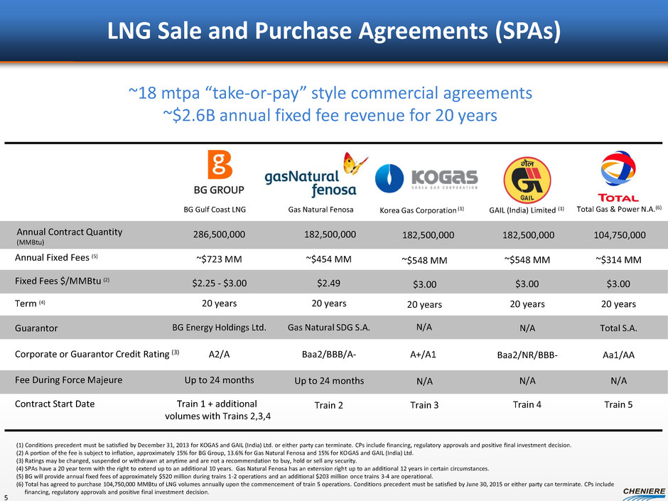LNG Sale and Purchase Agreements (SPAs) (1) Conditions precedent must be satisfied by December 31, 2013 for KOGAS and GAIL (India) Ltd. or either party can terminate. CPs include financing, regulatory approvals and positive final investment decision. (2) A portion of the fee is subject to inflation, approximately 15% for BG Group, 13.6% for Gas Natural Fenosa and 15% for KOGAS and GAIL (India) Ltd. (3) Ratings may be changed, suspended or withdrawn at anytime and are not a recommendation to buy, hold or sell any security. (4) SPAs have a 20 year term with the right to extend up to an additional 10 years. Gas Natural Fenosa has an extension right up to an additional 12 years in certain circumstances. (5) BG will provide annual fixed fees of approximately $520 million during trains 1-2 operations and an additional $203 million once trains 3-4 are operational. (6) Total has agreed to purchase 104,750,000 MMBtu of LNG volumes annually upon the commencement of train 5 operations. Conditions precedent must be satisfied by June 30, 2015 or either party can terminate. CPs include financing, regulatory approvals and positive final investment decision. BG Gulf Coast LNG Gas Natural Fenosa Annual Contract Quantity (MMBtu) 286,500,000 Fixed Fees $/MMBtu (2) Annual Fixed Fees (5) ~$723 MM ~$454 MM Term (4) Guarantor 20 years BG Energy Holdings Ltd. Gas Natural SDG S.A. Corporate or Guarantor Credit Rating (3) A2/A Baa2/BBB/A- Fee During Force Majeure Up to 24 months Up to 24 months 20 years GAIL (India) Limited (1) ~$548 MM 20 years Baa2/NR/BBB- N/A ~18 mtpa “take-or-pay” style commercial agreements ~$2.6B annual fixed fee revenue for 20 years N/A Contract Start Date Train 1 + additional volumes with Trains 2,3,4 Train 2 Train 4 $2.25 - $3.00 $2.49 $3.00 182,500,000 182,500,000 20 years N/A N/A A+/A1 Train 3 $3.00 ~$548 MM Korea Gas Corporation (1) 182,500,000 5 ~$314 MM 20 years Aa1/AA N/A Total S.A. Train 5 $3.00 104,750,000 Total Gas & Power N.A.(6)