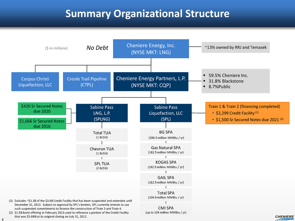 Trains 1&2 Financing Trains 1&2 Financing Sources Uses Bank Credit Facility 2,299 $ Capex, allowancies and contingencies 4,929 $ Equity contribution (1) 1,934 Operating cash flow 255 Up-front fees and expenses 248 Total Sources 5,988 $ Total Uses 5,998 $ ($ in millions) 7 (1) Includes $44MM contributed capital for early development costs. (2) Subject to approval by Sabine Pass Liquefaction's lenders, Sabine Pass Liquefaction currently intends to use such suspended commitments to finance the construction of Train 3 and Train 4. Note: The above represents a single financing scenario. Estimates represent a summary of internal forecasts, are based on current assumptions and are subject to change. Actual performance may differ materially from, and there is no plan to update, the forecast. See “Forward Looking Statements” slide. See Cheniere Energy, Inc. 8-K filed August 9, 2012 for a more detailed summary of the terms of the Blackstone transaction. See Cheniere Energy, Inc. 8-K filed August 6, 2012 for a more detailed summary of the credit facility. Bonds: $1.5B senior secured notes issued on Feb. 1, 2013 • Ratings: BB+ rating from S&P, Ba3 from Moody’s • Pari passu to bank debt • 8 year maturity; 5.625% coupon Credit facility funding for Trains 1 – 2 closed July 2012 • $3.6B facility; ~$1.3B suspended in connection with $1.5B bond financing and expected to be used for Trains 3&4 (2) • 7 year term; 18 year amortization profile • L+350 stepping up to L+375 • Minimum base case DSCR >2.00x • Bank group consisted of 21 European, Asian, Canadian and U.S. institutions Bonds 1,500 Interest during construction 811 $2.0B gross proceeds in equity raised by CQP • $0.5B Cheniere equity funded by Jul 2012 • $1.5B Blackstone equity funded by Dec 2012 $1.89B net proceeds equity fully funded at SPL