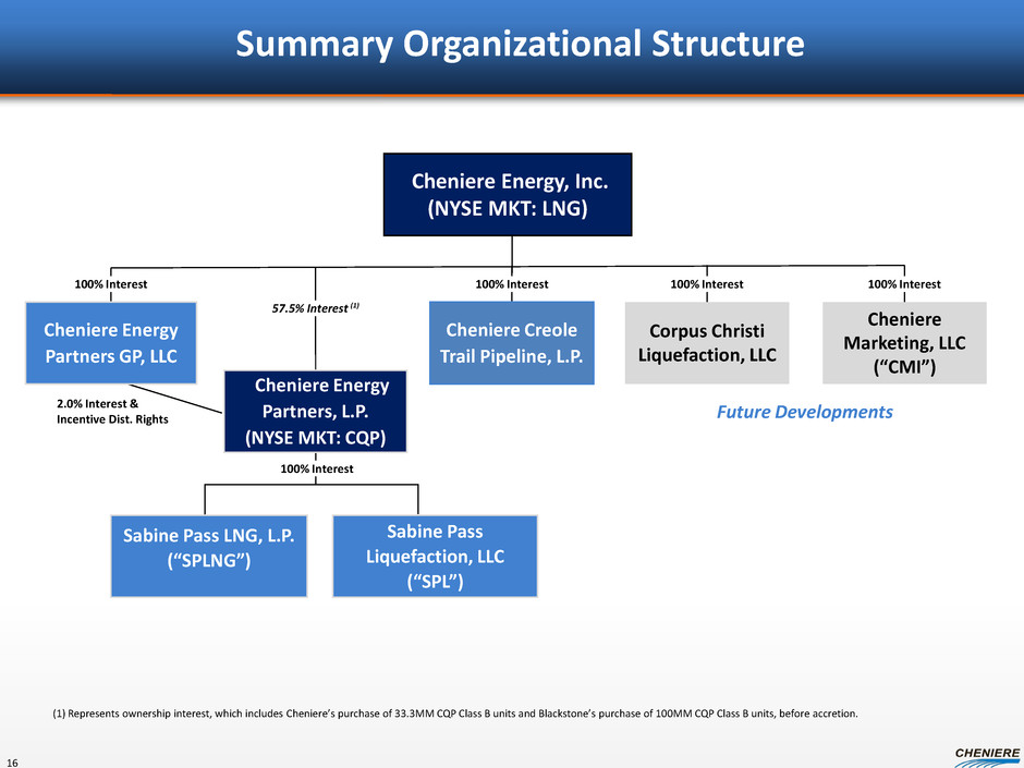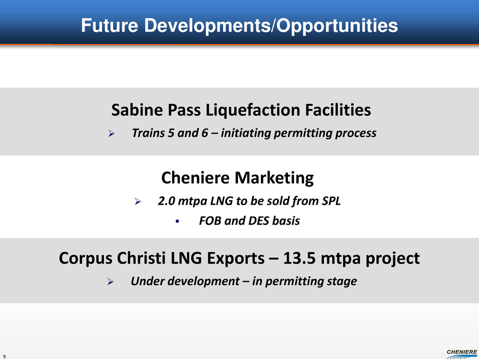Summary Organizational Structure Cheniere Energy, Inc. (NYSE MKT: LNG) Cheniere Energy Partners, L.P. (NYSE MKT: CQP) Sabine Pass LNG, L.P. (SPLNG) 59.5% Cheniere Inc. 31.8% Blackstone 8.7%Public BG SPA (286.5 million MMBtu / yr) Gas Natural SPA (182.5 million MMBtu / yr) KOGAS SPA (182.5 million MMBtu / yr) GAIL SPA (182.5 million MMBtu / yr) Total TUA (1 Bcf/d) Chevron TUA (1 Bcf/d) SPL TUA (2 Bcf/d) $420 Sr Secured Notes due 2020 $1,666 Sr Secured Notes due 2016 ($ in millions) No Debt Creole Trail Pipeline (CTPL) Corpus Christi Liquefaction, LLC 8 Train 1 & Train 2 (financing completed) • $2,299 Credit Facility (1) • $1,500 Sr Secured Notes due 2021 (2) CMI SPA (up to 104 million MMBtu / yr) Total SPA (104.8 million MMBtu / yr) Sabine Pass Liquefaction, LLC (SPL) (1) Excludes ~$1.3B of the $3.6B Credit Facility that has been suspended and extended until December 31, 2013. Subject to approval by SPL’s lenders, SPL currently intends to use such suspended commitments to finance the construction of Train 3 and Train 4. (2) $1.5B bond offering in February 2013 used to refinance a portion of the Credit Facility that was $3.6BN at its original closing on July 31, 2012. ~13% owned by RRJ and Temasek