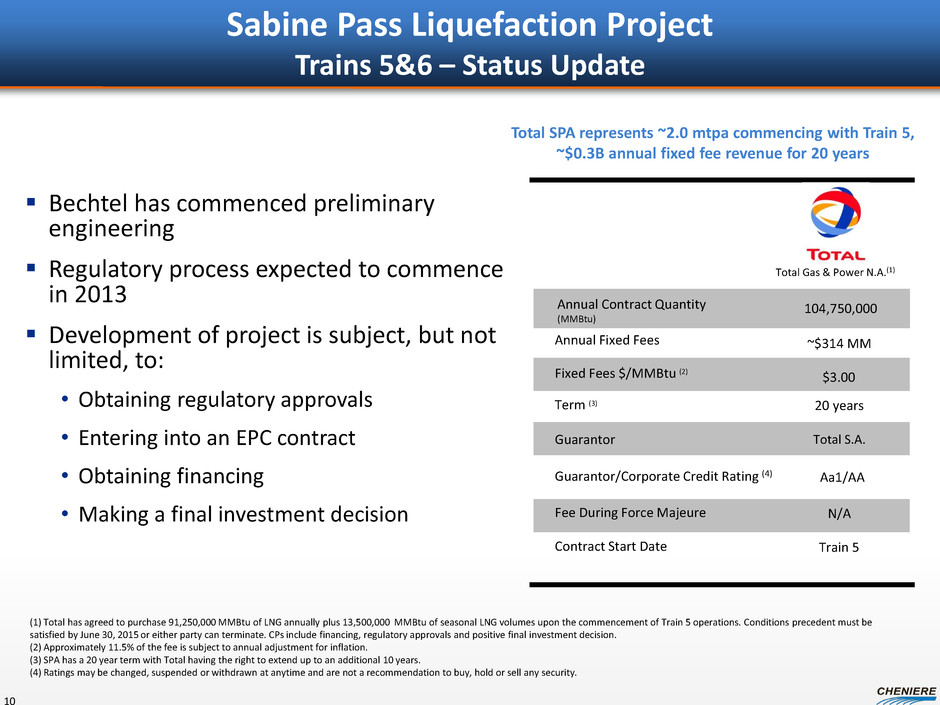 Sabine Pass Liquefaction Facilities Trains 5 and 6 – initiating permitting process Future Developments/Opportunities Cheniere Marketing 2.0 mtpa LNG to be sold from SPL FOB and DES basis Corpus Christi LNG Exports – 13.5 mtpa project Under development – in permitting stage 9