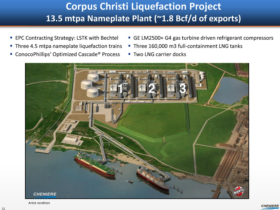 CMI SPA – Excess Volumes from Trains 1-4 at SPL CMI-SPL SPA provides CMI with up to 2 mtpa of LNG delivered FOB Sabine Pass starting with the initial production from Train 1 •Maximum Annual Contract Quantity of up to 104 Tbtu/year from first four trains SPA sharing mechanic incents profit maximization • Sharing based on ranking of the net profit for each cargo, from highest to lowest: – Tranche 1: CMI pays SPL up to $3.00/MMBtu – Tranche 2: CMI pays SPL 20% of profits • Tranches shift at 18 TBtu for T1&T2, 36 TBtu for T3&T4 • CMI is entitled to recover all operating costs during a year before allocating profit to SPL Initial deliveries anticipated to begin as early as 4Q 2015 11 Note: See “Forward Looking Statements” slide. LNG sold 104 Bcf Net margin $10/MMBtu Net margin $1 BN Example Annual Cash Flow on CMI SPA