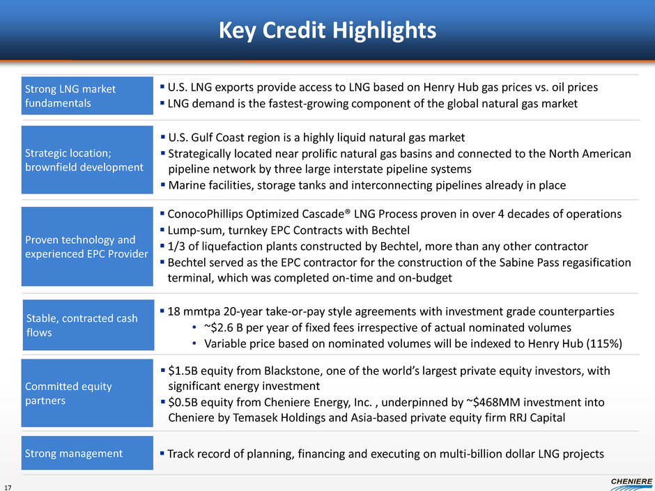 2.0% Interest & Incentive Dist. Rights Cheniere Energy, Inc. (NYSE MKT: LNG) Sabine Pass LNG, L.P. (“SPLNG”) Sabine Pass Liquefaction, LLC (“SPL”) Cheniere Energy Partners, L.P. (NYSE MKT: CQP) Cheniere Creole Trail Pipeline, L.P. Corpus Christi Liquefaction, LLC Cheniere Marketing, LLC (“CMI”) Cheniere Energy Partners GP, LLC 57.5% Interest (1) 100% Interest 100% Interest 100% Interest 100% Interest 100% Interest (1) Represents ownership interest, which includes Cheniere’s purchase of 33.3MM CQP Class B units and Blackstone’s purchase of 100MM CQP Class B units, before accretion. Future Developments Summary Organizational Structure 16
