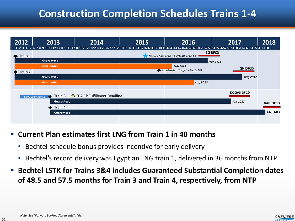 Why Bechtel Constructed one-third of the world’s liquefaction facilities - more than any other contractor Top US construction contractor for 14 straight years by Engineering News-Record Bechtel was the EPC contractor for the regasification project at the Sabine Pass LNG Terminal, which was constructed on time and on budget Bechtel Experience Key Competitive and Cost Advantages Existing SPLNG infrastructure provides significant cost advantages • Jetty, pipeline, control room, 17 Bcf storage tanks, etc. Economies of scale from building multiple trains Easy access to the Gulf Coast labor pool and we believe labor relations are strong Established marine and road access provide easy delivery of materials Project name Country COD date Type Wheatstone LNG Australia TBD Cost replacement Gladstone LNG Australia 2015 Lump sum Australia Pacific LNG Australia 2015 Lump sum Curtis LNG Australia 2014 Lump sum Angola LNG Angola 2012 Lump sum Equatorial Guine LNG Equatorial Guinea 2007 Lump sum Darwin LNG Australia 2006 Lump sum Atlantic LNG Trinidad & Tobago 2006 (1) Lump sum Egypt LNG Egypt 2005 Lump sum Kenai LNG Alaska 1969 Construction only (1) Commercial operation of Train 1 in 1999, Train 2 in 2002, Train 3 in 2003 and Train 4 in 2006. LSTK EPC Contract with Bechtel and Expansion Minimize Construction Costs and Risks 19