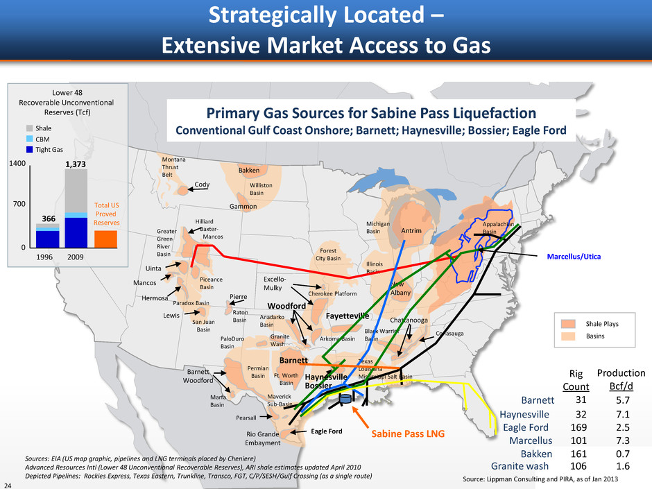 US Gas Consumptions vs. Production US Proved Non-Producing Reserves Productive Capacity from Unconventional Reservoirs Tcf Bcf/d MMB/d Current market fundamentals in the U.S. – increased production, increased natural gas reserves and lackluster increase in natural gas demand – have created an opportunity to expand into exports – benefitting U.S. economy, creating jobs and reducing balance of trade Source: EIA historical, December 2011 Short-Term Energy Outlook (2011 data). 49 51 60 67 78 85 98 0 20 40 60 80 100 120 2003 2004 2005 2006 2007 2008 2009 Source: EIA, US Crude Oil, Natural Gas and Natural Gas Liquids Proved Reserves, 2009. Source: Advanced Resource Intl; Cheniere Research. U.S. Natural Gas Markets 18.1 18.5 19.3 20.2 20.6 21.6 23.0 23.6 22.0 21.7 23.1 23.3 22.8 24.1 24.5 24.9 10 12 14 16 18 20 22 24 26 2005 2006 2007 2008 2009 2010 2011 2012E US Gas Production US Gas Consumption Tcf 23 Includes Eagle Ford, Barnett Combo, Bakken, Permian, Anadarko, W. Marcellus, Utica, Cotton Valley, Piceance & Uinta US Natural Gas Resources Tcf 1,365 1,747 2,119 2,543 0 500 1,000 1,500 2,000 2,500 3,000 2008 2009 2010 2011 Oher Shale Source: DOE, Annual Energy Outlook 2008-2011.