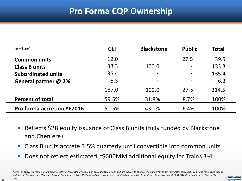 Pro Forma CQP Ownership Common units Class B units Subordinated units General partner @ 2% 27.5 12.0 33.3 135.4 6.3 Public CEI 27.5 187.0 (in millions) 39.5 133.3 135.4 6.3 314.5 Total 59.5% 8.7% 100% Percent of total - - - Blackstone 31.8% 100.0 - - - 100.0 Reflects $2B equity issuance of Class B units (fully funded by Blackstone and Cheniere) Class B units accrete 3.5% quarterly until convertible into common units Does not reflect estimated ~$600MM additional equity for Trains 3-4 50.5% 6.4% 100% Pro forma accretion YE2016 43.1% Note: The above represents a summary of internal forecasts, are based on current assumptions and are subject to change. Actual performance may differ materially from, and there is no plan to update, the forecast. See “Forward Looking Statements” slide. Unit amounts are current units outstanding, including Blackstone’s total investment of $1.5B but excluding accretion of Class B Units. 28
