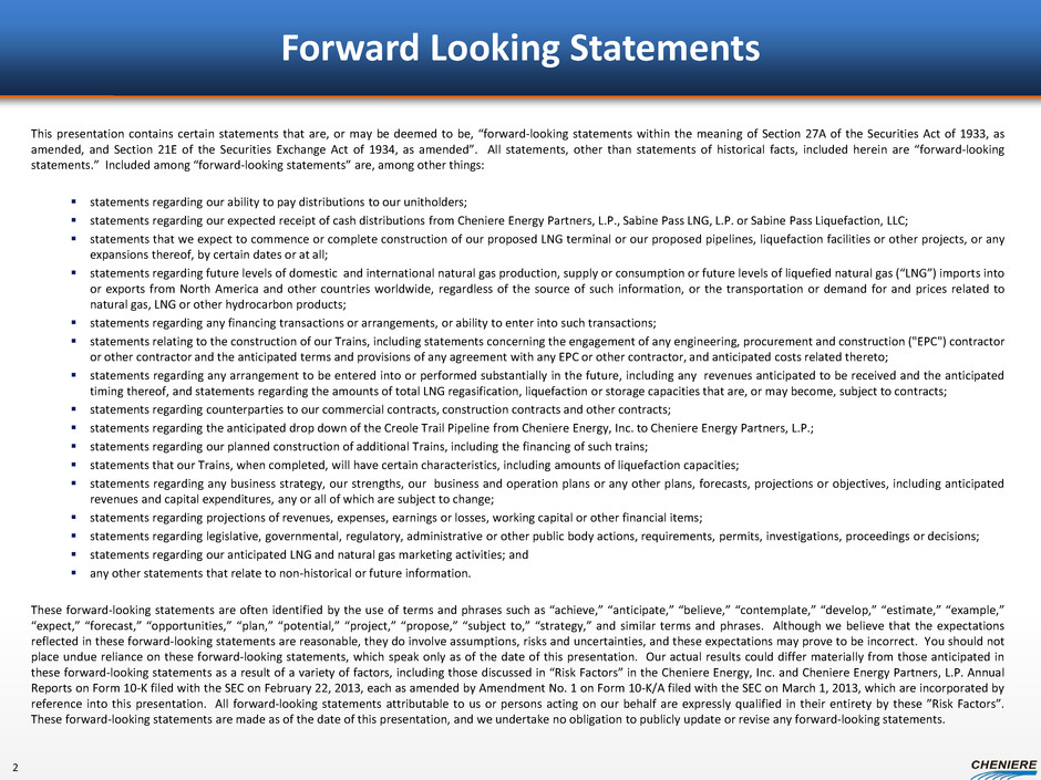 Forward Looking Statements 2 This presentation contains certain statements that are, or may be deemed to be, “forward-looking statements within the meaning of Section 27A of the Securities Act of 1933, as amended, and Section 21E of the Securities Exchange Act of 1934, as amended”. All statements, other than statements of historical facts, included herein are “forward-looking statements.” Included among “forward-looking statements” are, among other things: statements regarding our ability to pay distributions to our unitholders; statements regarding our expected receipt of cash distributions from Cheniere Energy Partners, L.P., Sabine Pass LNG, L.P. or Sabine Pass Liquefaction, LLC; statements that we expect to commence or complete construction of our proposed LNG terminal or our proposed pipelines, liquefaction facilities or other projects, or any expansions thereof, by certain dates or at all; statements regarding future levels of domestic and international natural gas production, supply or consumption or future levels of liquefied natural gas (“LNG”) imports into or exports from North America and other countries worldwide, regardless of the source of such information, or the transportation or demand for and prices related to natural gas, LNG or other hydrocarbon products; statements regarding any financing transactions or arrangements, or ability to enter into such transactions; statements relating to the construction of our Trains, including statements concerning the engagement of any engineering, procurement and construction ("EPC") contractor or other contractor and the anticipated terms and provisions of any agreement with any EPC or other contractor, and anticipated costs related thereto; statements regarding any arrangement to be entered into or performed substantially in the future, including any revenues anticipated to be received and the anticipated timing thereof, and statements regarding the amounts of total LNG regasification, liquefaction or storage capacities that are, or may become, subject to contracts; statements regarding counterparties to our commercial contracts, construction contracts and other contracts; statements regarding the anticipated drop down of the Creole Trail Pipeline from Cheniere Energy, Inc. to Cheniere Energy Partners, L.P.; statements regarding our planned construction of additional Trains, including the financing of such trains; statements that our Trains, when completed, will have certain characteristics, including amounts of liquefaction capacities; statements regarding any business strategy, our strengths, our business and operation plans or any other plans, forecasts, projections or objectives, including anticipated revenues and capital expenditures, any or all of which are subject to change; statements regarding projections of revenues, expenses, earnings or losses, working capital or other financial items; statements regarding legislative, governmental, regulatory, administrative or other public body actions, requirements, permits, investigations, proceedings or decisions; statements regarding our anticipated LNG and natural gas marketing activities; and any other statements that relate to non-historical or future information. These forward-looking statements are often identified by the use of terms and phrases such as “achieve,” “anticipate,” “believe,” “contemplate,” “develop,” “estimate,” “example,” “expect,” “forecast,” “opportunities,” “plan,” “potential,” “project,” “propose,” “subject to,” “strategy,” and similar terms and phrases. Although we believe that the expectations reflected in these forward-looking statements are reasonable, they do involve assumptions, risks and uncertainties, and these expectations may prove to be incorrect. You should not place undue reliance on these forward-looking statements, which speak only as of the date of this presentation. Our actual results could differ materially from those anticipated in these forward-looking statements as a result of a variety of factors, including those discussed in “Risk Factors” in the Cheniere Energy, Inc. and Cheniere Energy Partners, L.P. Annual Reports on Form 10-K filed with the SEC on February 22, 2013, each as amended by Amendment No. 1 on Form 10-K/A filed with the SEC on March 1, 2013, which are incorporated by reference into this presentation. All forward-looking statements attributable to us or persons acting on our behalf are expressly qualified in their entirety by these ”Risk Factors”. These forward-looking statements are made as of the date of this presentation, and we undertake no obligation to publicly update or revise any forward-looking statements.