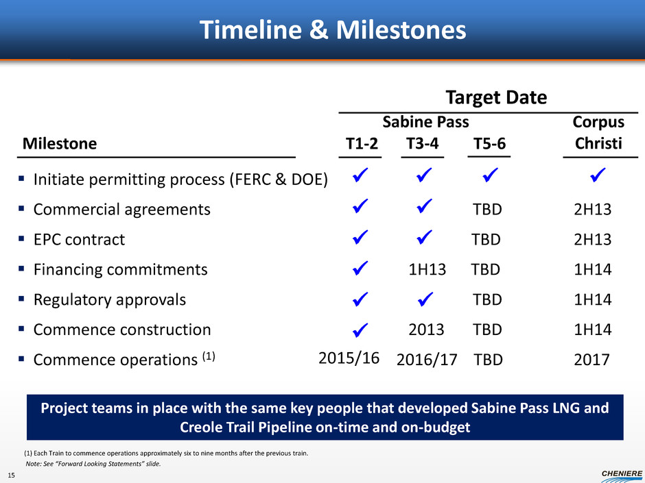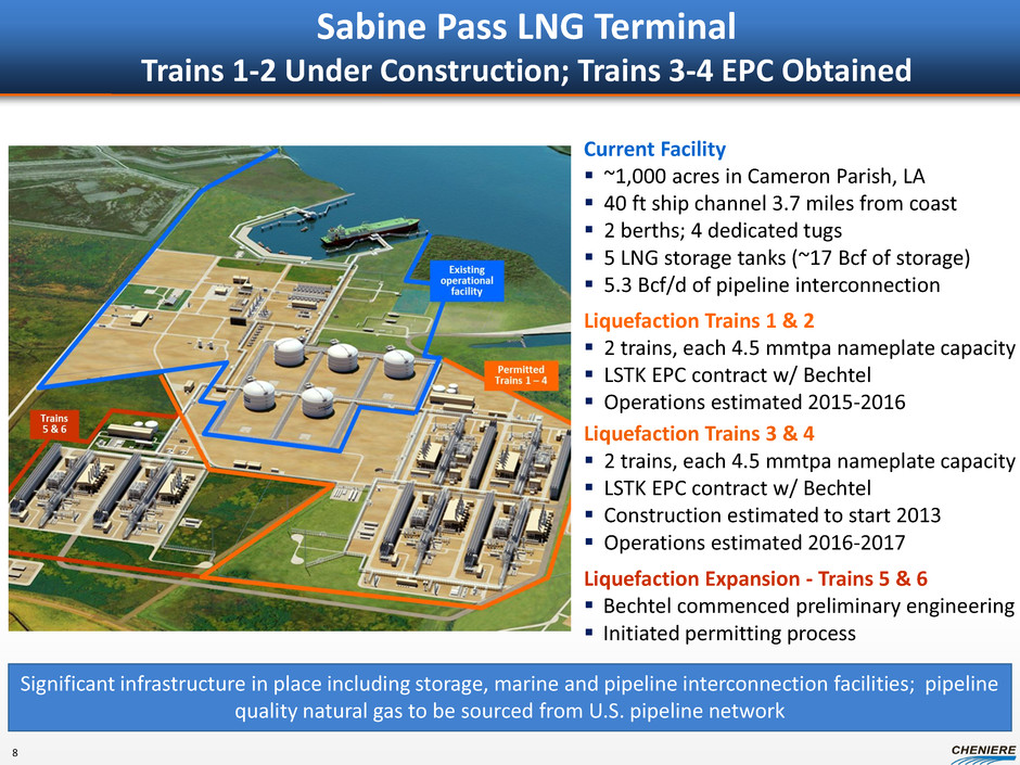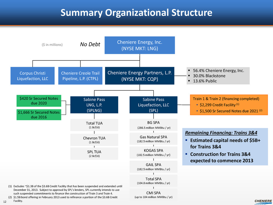 Summary Organizational Structure Cheniere Energy, Inc. (NYSE MKT: LNG) Cheniere Energy Partners, L.P. (NYSE MKT: CQP) Sabine Pass LNG, L.P. (SPLNG) BG SPA (286.5 million MMBtu / yr) Gas Natural SPA (182.5 million MMBtu / yr) KOGAS SPA (182.5 million MMBtu / yr) GAIL SPA (182.5 million MMBtu / yr) Total TUA (1 Bcf/d) Chevron TUA (1 Bcf/d) SPL TUA (2 Bcf/d) $420 Sr Secured Notes due 2020 $1,666 Sr Secured Notes due 2016 ($ in millions) No Debt Cheniere Creole Trail Pipeline, L.P. (CTPL) Corpus Christi Liquefaction, LLC Train 1 & Train 2 (financing completed) • $2,299 Credit Facility (1) • $1,500 Sr Secured Notes due 2021 (2) CMI SPA (up to 104 million MMBtu / yr) Total SPA (104.8 million MMBtu / yr) Sabine Pass Liquefaction, LLC (SPL) Remaining Financing: Trains 3&4 Estimated capital needs of $5B+ for Trains 3&4 Construction for Trains 3&4 expected to commence 2013 (1) Excludes ~$1.3B of the $3.6B Credit Facility that has been suspended and extended until December 31, 2013. Subject to approval by SPL’s lenders, SPL currently intends to use such suspended commitments to finance the construction of Train 3 and Train 4. (2) $1.5B bond offering in February 2013 used to refinance a portion of the $3.6B Credit Facility. 56.4% Cheniere Energy, Inc. 30.0% Blackstone 13.6% Public 12