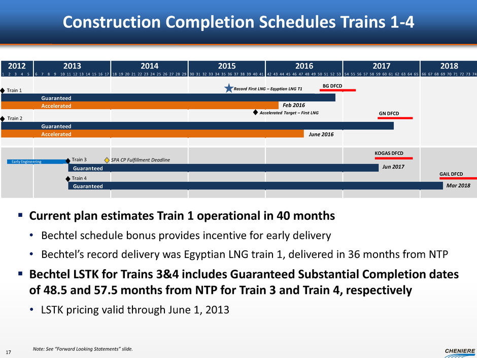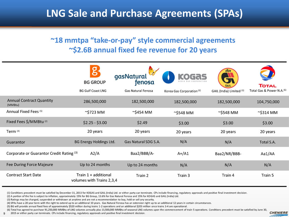 LNG Sale and Purchase Agreements (SPAs) (1) Conditions precedent must be satisfied by December 31, 2013 for KOGAS and GAIL (India) Ltd. or either party can terminate. CPs include financing, regulatory approvals and positive final investment decision. (2) A portion of the fee is subject to inflation, approximately 15% for BG Group, 13.6% for Gas Natural Fenosa and 15% for KOGAS and GAIL (India) Ltd. (3) Ratings may be changed, suspended or withdrawn at anytime and are not a recommendation to buy, hold or sell any security. (4) SPAs have a 20 year term with the right to extend up to an additional 10 years. Gas Natural Fenosa has an extension right up to an additional 12 years in certain circumstances. (5) BG will provide annual fixed fees of approximately $520 million during trains 1-2 operations and an additional $203 million once trains 3-4 are operational. (6) Total has agreed to purchase 91,250,000 MMBtu of LNG volumes annually plus 13,500,000 MMBtu of seasonal LNG volumes upon the commencement of train 5 operations. Conditions precedent must be satisfied by June 30, 2015 or either party can terminate. CPs include financing, regulatory approvals and positive final investment decision. BG Gulf Coast LNG Gas Natural Fenosa Annual Contract Quantity (MMBtu) 286,500,000 Fixed Fees $/MMBtu (2) Annual Fixed Fees (5) ~$723 MM ~$454 MM Term (4) Guarantor 20 years BG Energy Holdings Ltd. Gas Natural SDG S.A. Corporate or Guarantor Credit Rating (3) A2/A Baa2/BBB/A- Fee During Force Majeure Up to 24 months Up to 24 months 20 years GAIL (India) Limited (1) ~$548 MM 20 years Baa2/NR/BBB- N/A ~18 mmtpa “take-or-pay” style commercial agreements ~$2.6B annual fixed fee revenue for 20 years N/A Contract Start Date Train 1 + additional volumes with Trains 2,3,4 Train 2 Train 4 $2.25 - $3.00 $2.49 $3.00 182,500,000 182,500,000 20 years N/A N/A A+/A1 Train 3 $3.00 ~$548 MM Korea Gas Corporation (1) 182,500,000 ~$314 MM 20 years Aa1/AA N/A Total S.A. Train 5 $3.00 104,750,000 Total Gas & Power N.A.(6) 9