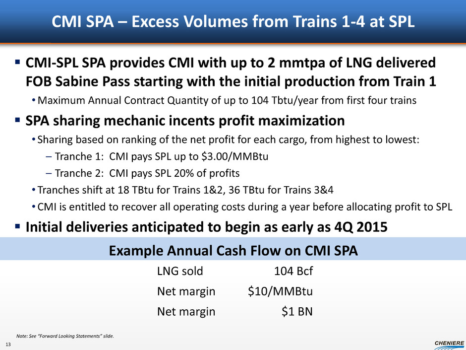 CMI SPA – Excess Volumes from Trains 1-4 at SPL CMI-SPL SPA provides CMI with up to 2 mmtpa of LNG delivered FOB Sabine Pass starting with the initial production from Train 1 •Maximum Annual Contract Quantity of up to 104 Tbtu/year from first four trains SPA sharing mechanic incents profit maximization • Sharing based on ranking of the net profit for each cargo, from highest to lowest: – Tranche 1: CMI pays SPL up to $3.00/MMBtu – Tranche 2: CMI pays SPL 20% of profits • Tranches shift at 18 TBtu for Trains 1&2, 36 TBtu for Trains 3&4 • CMI is entitled to recover all operating costs during a year before allocating profit to SPL Initial deliveries anticipated to begin as early as 4Q 2015 Note: See “Forward Looking Statements” slide. LNG sold 104 Bcf Net margin $10/MMBtu Net margin $1 BN Example Annual Cash Flow on CMI SPA 13