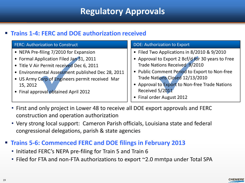 • NEPA Pre-filing 7/2010 for Expansion • Formal Application Filed Jan 31, 2011 • Title V Air Permit received Dec 6, 2011 • Environmental Assessment published Dec 28, 2011 • US Army Corp of Engineers permit received Mar 15, 2012 • Final approval obtained April 2012 • Filed Two Applications in 8/2010 & 9/2010 • Approval to Export 2 Bcf/d for 30 years to Free Trade Nations Received 9/2010 • Public Comment Period to Export to Non-free Trade Nations Closed 12/13/2010 • Approval to Export to Non-free Trade Nations Received 5/2011 • Final order August 2012 Regulatory Approvals FERC: Authorization to Construct DOE: Authorization to Export • First and only project in Lower 48 to receive all DOE export approvals and FERC construction and operation authorization • Very strong local support: Cameron Parish officials, Louisiana state and federal congressional delegations, parish & state agencies Trains 1-4: FERC and DOE authorization received Trains 5-6: Commenced FERC and DOE filings in February 2013 • Initiated FERC’s NEPA pre-filing for Train 5 and Train 6 • Filed for FTA and non-FTA authorizations to export ~2.0 mmtpa under Total SPA 19