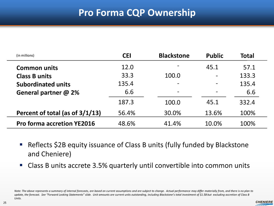 Pro Forma CQP Ownership Common units Class B units Subordinated units General partner @ 2% 45.1 12.0 33.3 135.4 6.6 Public CEI 45.1 187.3 (in millions) 57.1 133.3 135.4 6.6 332.4 Total 56.4% 13.6% 100% Percent of total (as of 3/1/13) - - - Blackstone 30.0% 100.0 - - - 100.0 Reflects $2B equity issuance of Class B units (fully funded by Blackstone and Cheniere) Class B units accrete 3.5% quarterly until convertible into common units 48.6% 10.0% 100% Pro forma accretion YE2016 41.4% Note: The above represents a summary of internal forecasts, are based on current assumptions and are subject to change. Actual performance may differ materially from, and there is no plan to update, the forecast. See “Forward Looking Statements” slide. Unit amounts are current units outstanding, including Blackstone’s total investment of $1.5B but excluding accretion of Class B Units. 25