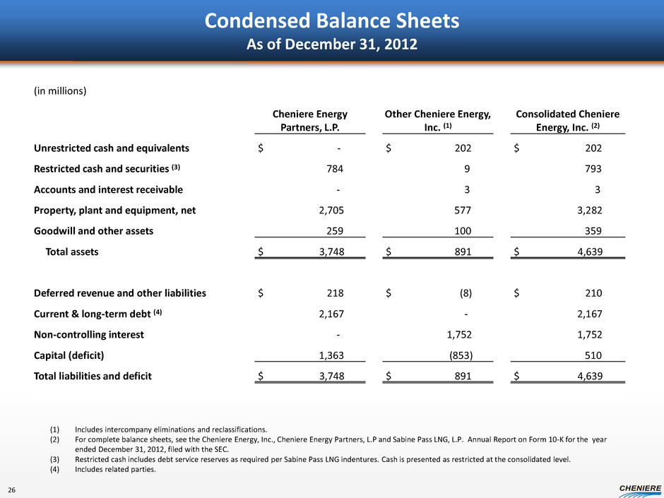 Condensed Balance Sheets As of December 31, 2012 (1) Includes intercompany eliminations and reclassifications. (2) For complete balance sheets, see the Cheniere Energy, Inc., Cheniere Energy Partners, L.P and Sabine Pass LNG, L.P. Annual Report on Form 10-K for the year ended December 31, 2012, filed with the SEC. (3) Restricted cash includes debt service reserves as required per Sabine Pass LNG indentures. Cash is presented as restricted at the consolidated level. (4) Includes related parties. (in millions) Cheniere Energy Partners, L.P. Other Cheniere Energy, Inc. (1) Consolidated Cheniere Energy, Inc. (2) Unrestricted cash and equivalents $ - $ 202 $ 202 Restricted cash and securities (3) 784 9 793 Accounts and interest receivable - 3 3 Property, plant and equipment, net 2,705 577 3,282 Goodwill and other assets 259 100 359 Total assets $ 3,748 $ 891 $ 4,639 Deferred revenue and other liabilities $ 218 $ (8) $ 210 Current & long-term debt (4) 2,167 - 2,167 Non-controlling interest - 1,752 1,752 Capital (deficit) 1,363 (853) 510 Total liabilities and deficit $ 3,748 $ 891 $ 4,639 26