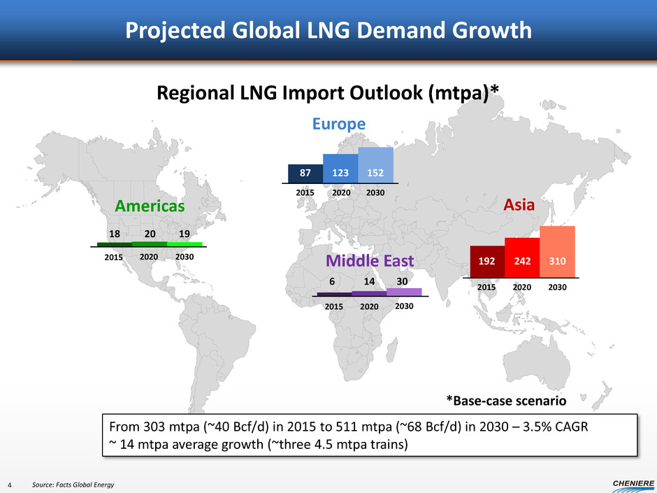 Forward Looking Statements 2 This presentation contains certain statements that are, or may be deemed to be, “forward-looking statements” within the meaning of Section 27A of the Securities Act of 1933, as amended, and Section 21E of the Securities Exchange Act of 1934, as amended. All statements, other than statements of historical facts, included herein are “forward-looking statements.” Included among “forward-looking statements” are, among other things: statements regarding the ability of Cheniere Energy Partners, L.P. to pay distributions to its unitholders; statements regarding Cheniere Energy Partners, L.P.’s expected receipt of cash distributions from Sabine Pass LNG, L.P., Sabine Pass Liquefaction, LLC or Cheniere Creole Trail Pipeline, L.P.; statements that Cheniere Energy Partners, L.P. expects to commence or complete construction of its proposed liquefaction facilities, or any expansions thereof, by certain dates or at all; statements that Cheniere Energy, Inc. expects to commence or complete construction of its proposed liquefaction facilities or other projects by certain dates or at all; statements regarding future levels of domestic and international natural gas production, supply or consumption or future levels of liquefied natural gas (“LNG”) imports into or exports from North America and other countries worldwide, regardless of the source of such information, or the transportation or demand for and prices related to natural gas, LNG or other hydrocarbon products; statements regarding any financing transactions or arrangements, or ability to enter into such transactions; statements relating to the construction of our natural gas liquefaction trains (“Trains”), or modifications to the Creole Trail Pipeline, including statements concerning the engagement of any engineering, procurement and construction ("EPC") contractor or other contractor and the anticipated terms and provisions of any agreement with any EPC or other contractor, and anticipated costs related thereto; statements regarding any agreement to be entered into or performed substantially in the future, including any revenues anticipated to be received and the anticipated timing thereof, and statements regarding the amounts of total LNG regasification, liquefaction or storage capacities that are, or may become, subject to contracts; statements regarding counterparties to our commercial contracts, construction contracts and other contracts; statements regarding our planned construction of additional Trains, including the financing of such Trains; statements that our Trains, when completed, will have certain characteristics, including amounts of liquefaction capacities; statements regarding any business strategy, our strengths, our business and operation plans or any other plans, forecasts, projections or objectives, including anticipated revenues and capital expenditures and EBITDA, any or all of which are subject to change; statements regarding projections of revenues, expenses, earnings or losses, working capital or other financial items; statements regarding legislative, governmental, regulatory, administrative or other public body actions, approvals, requirements, permits, applications, filings, investigations, proceedings or decisions; statements regarding our anticipated LNG and natural gas marketing activities; and any other statements that relate to non-historical or future information. These forward-looking statements are often identified by the use of terms and phrases such as “achieve,” “anticipate,” “believe,” “contemplate,” “develop,” “estimate,” “example,” “expect,” “forecast,” “opportunities,” “plan,” “potential,” “project,” “propose,” “subject to,” “strategy,” and similar terms and phrases, or by use of future tense. Although we believe that the expectations reflected in these forward-looking statements are reasonable, they do involve assumptions, risks and uncertainties, and these expectations may prove to be incorrect. You should not place undue reliance on these forward-looking statements, which speak only as of the date of this presentation. Our actual results could differ materially from those anticipated in these forward-looking statements as a result of a variety of factors, including those discussed in “Risk Factors” in the Cheniere Energy, Inc. and Cheniere Energy Partners, L.P. Annual Reports on Form 10-K filed with the SEC on February 22, 2013, each as amended by Amendment No. 1 on Form 10-K/A filed with the SEC on March 1, 2013, and the Cheniere Energy Partners, L.P. Current Report on Form 8-K filed with the SEC on May 29, 2013, which are incorporated by reference into this presentation. All forward-looking statements attributable to us or persons acting on our behalf are expressly qualified in their entirety by these ”Risk Factors”. These forward-looking statements are made as of the date of this presentation, and other than as required under the securities laws, we undertake no obligation to publicly update or revise any forward-looking statements.
