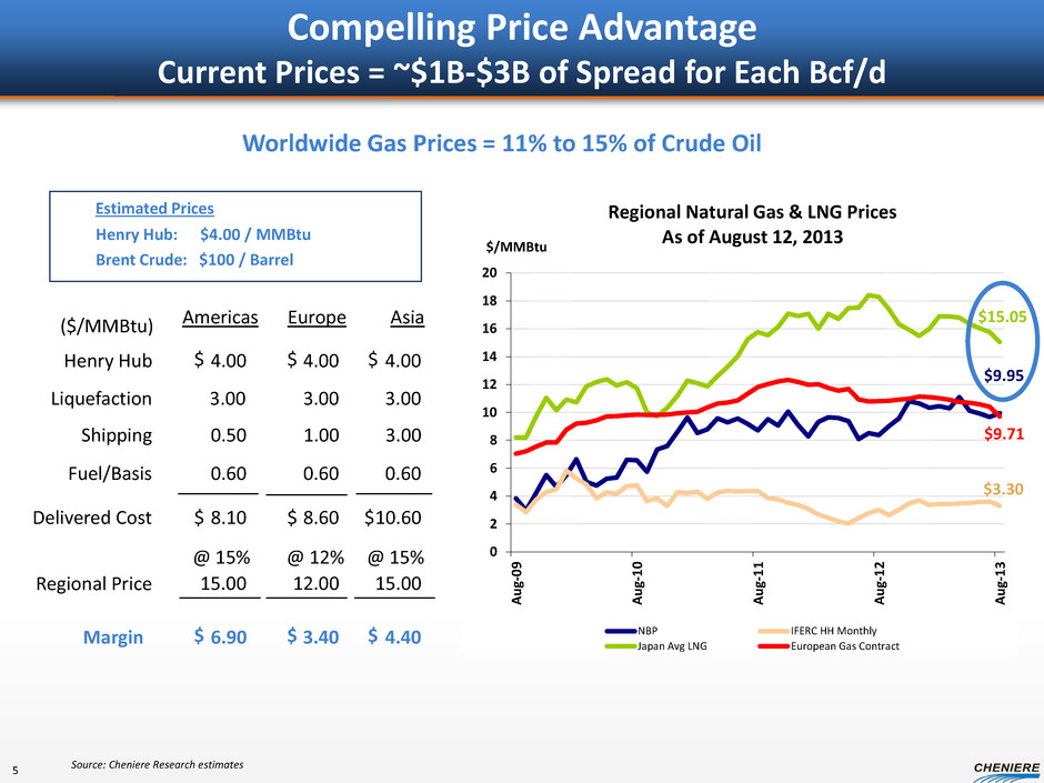 Source: Office of Oil and Gas Global Security and Supply, Office of Fossil Energy, U.S. Department of Energy; U.S. Federal Energy Regulatory Commission; Company releases U.S. DOE Applications for LNG Exports* ** Application filed = v, FERC scheduling notice issued = 14 Expected Order to be Processed (1) Company Date Applicant Received FERC Approval to Begin Pre-Filing Process Quantity (Bcf/d) Date Non FTA Received FERC** Contracts Cheniere Sabine Pass T1-T4 8/4/2010 2.2 5/20/2011 Fully Subscribed 1 Freeport LNG Expansion, L.P. and FLNG Liquefaction 1/5/2011 1.4 5/17/2013 T1 – T3 2 Lake Charles Exports, LLC 4/6/2012 2.0 8/7/2013 3 Dominion Cove Point LNG, LP 6/26/2012 1.0 v Fully Subscribed 4 Freeport LNG Expansion, L.P. and FLNG Liquefaction 1/5/2011 1.4 5 Cameron LNG, LLC 5/9/2012 1.7 Fully Subscribed 6 Jordan Cove Energy Project, L.P. 3/6/2012 1.2/0.8 v 7 LNG Development Company, LLC (d/b/a Oregon LNG) 7/16/2012 1.25 v 8 Cheniere Marketing, LLC (Corpus Christi) 12/22/2011 2.1 v 9 Excelerate Liquefaction Solutions 11/20/2012 1.38 10 Carib Energy (USA) LLC 0.03/0.01 11 Gulf Coast LNG Export, LLC 2.8 12 Southern LNG Company, L.L.C. 0.5 13 Gulf LNG Liquefaction Company, LLC 1.5 14 CE FLNG, LLC 1.07 15 Golden Pass Products LLC 2.6 16 Pangea LNG (North America) Holdings, LLC 1.09 Cheniere Sabine Pass T5 3/8/2013 0.52 T5 Subscribed Cheniere Sabine Pass T6 T6 Unsubscribed * As of June 30, 2013. Note additional companies have filed for their DOE license; however, not all have initiated their FERC filing process. (1) “Order of Precedence”