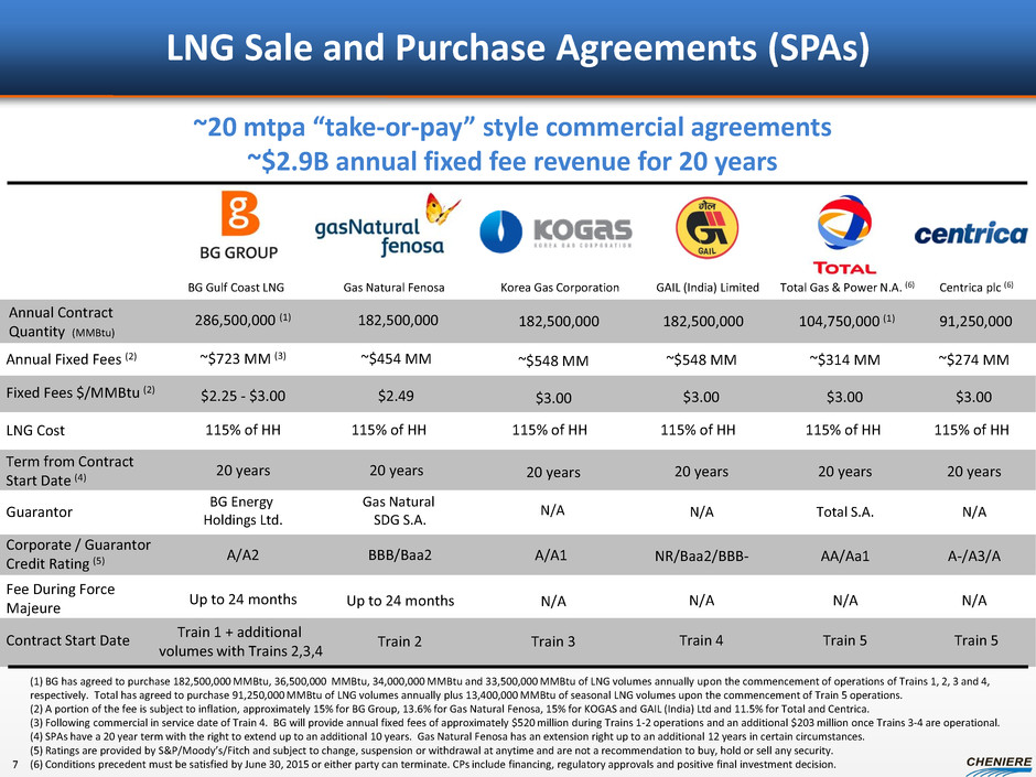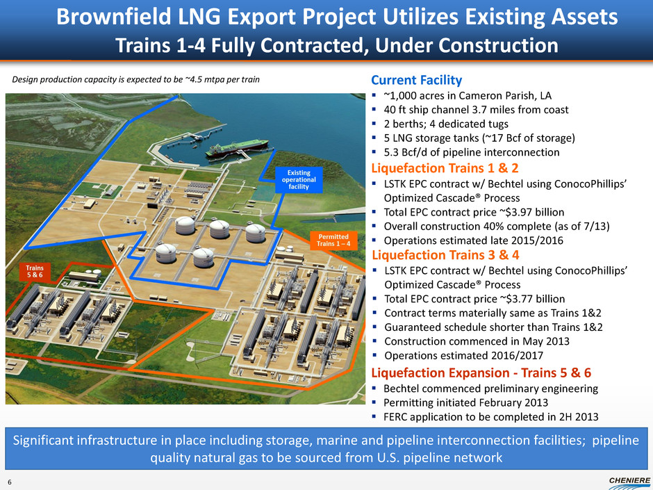Brownfield LNG Export Project Utilizes Existing Assets Trains 1-4 Fully Contracted, Under Construction Significant infrastructure in place including storage, marine and pipeline interconnection facilities; pipeline quality natural gas to be sourced from U.S. pipeline network Liquefaction Trains 3 & 4 LSTK EPC contract w/ Bechtel using ConocoPhillips’ Optimized Cascade® Process Total EPC contract price ~$3.77 billion Contract terms materially same as Trains 1&2 Guaranteed schedule shorter than Trains 1&2 Construction commenced in May 2013 Operations estimated 2016/2017 Liquefaction Expansion - Trains 5 & 6 Bechtel commenced preliminary engineering Permitting initiated February 2013 FERC application to be completed in 2H 2013 Current Facility ~1,000 acres in Cameron Parish, LA 40 ft ship channel 3.7 miles from coast 2 berths; 4 dedicated tugs 5 LNG storage tanks (~17 Bcf of storage) 5.3 Bcf/d of pipeline interconnection Liquefaction Trains 1 & 2 LSTK EPC contract w/ Bechtel using ConocoPhillips’ Optimized Cascade® Process Total EPC contract price ~$3.97 billion Overall construction 40% complete (as of 7/13) Operations estimated late 2015/2016 Design production capacity is expected to be ~4.5 mtpa per train 6