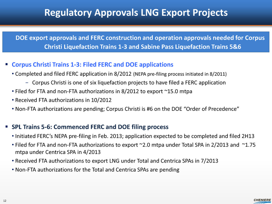 - 500 1,000 1,500 2,000 * * * * Range of liquefaction project costs: $200 - $2,000+ per ton 1 Bcf/d of capacity = $1.5B to $15.0B+ Corpus Christi liquefaction project estimated costs are ~$800/ton (1) Corpus Christi Liquefaction, LLC Competitive With Other Recent Greenfield Liquefaction Projects (1) Before financing costs, includes Corpus Christi Pipeline. Cost estimates based on lump-sum-turnkey contract price received from Bechtel for three 4.5 mtpa Trains and company estimates for owner’s costs. Source: Wood Mackenzie; Cheniere Research. Project costs reflect the liquefaction facility’s capex in dollars per ton. Chart includes a representative sample of brownfield and greenfield liquefaction facilities and does not include all liquefaction facilities existing or under construction. Note: Past results not a guarantee of future performance. *ConocoPhillips-Bechtel Cost: $/ton Trains under construction Operating trains – ConocoPhillips-Bechtel Operating trains – Other 11