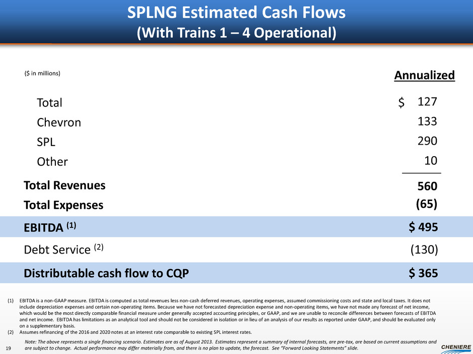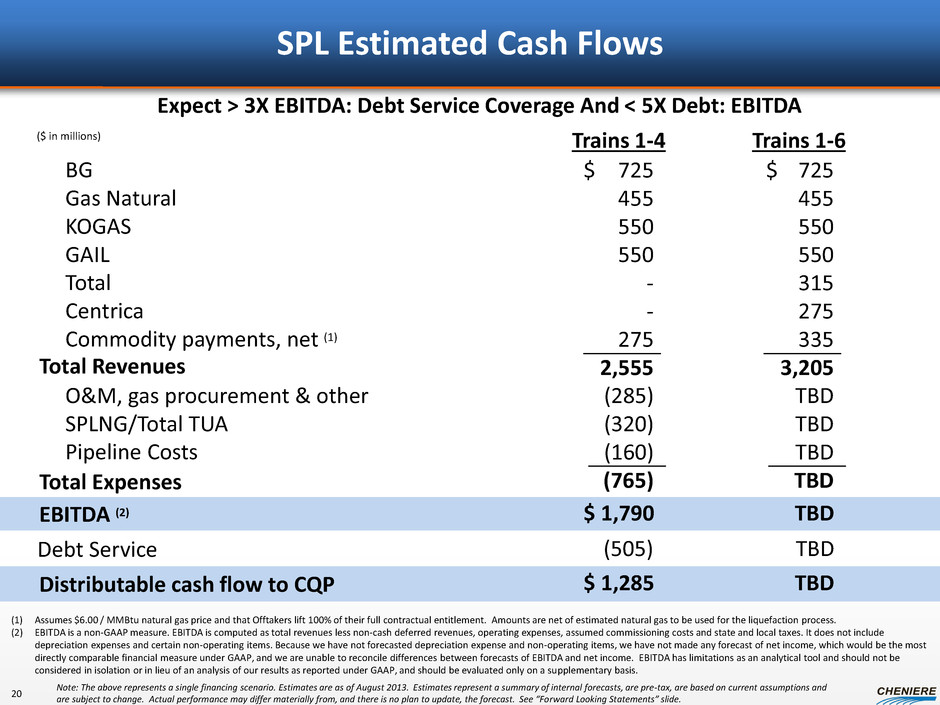 SPLNG Estimated Cash Flows (With Trains 1 – 4 Operational) Total Revenues Total Expenses Total Chevron SPL Other EBITDA (1) 127 133 290 10 560 (65) $ 495 $ Distributable cash flow to CQP $ 365 ($ in millions) Debt Service (2) (130) Annualized (1) EBITDA is a non-GAAP measure. EBITDA is computed as total revenues less non-cash deferred revenues, operating expenses, assumed commissioning costs and state and local taxes. It does not include depreciation expenses and certain non-operating items. Because we have not forecasted depreciation expense and non-operating items, we have not made any forecast of net income, which would be the most directly comparable financial measure under generally accepted accounting principles, or GAAP, and we are unable to reconcile differences between forecasts of EBITDA and net income. EBITDA has limitations as an analytical tool and should not be considered in isolation or in lieu of an analysis of our results as reported under GAAP, and should be evaluated only on a supplementary basis. (2) Assumes refinancing of the 2016 and 2020 notes at an interest rate comparable to existing SPL interest rates. Note: The above represents a single financing scenario. Estimates are as of August 2013. Estimates represent a summary of internal forecasts, are pre-tax, are based on current assumptions and are subject to change. Actual performance may differ materially from, and there is no plan to update, the forecast. See “Forward Looking Statements” slide. 19