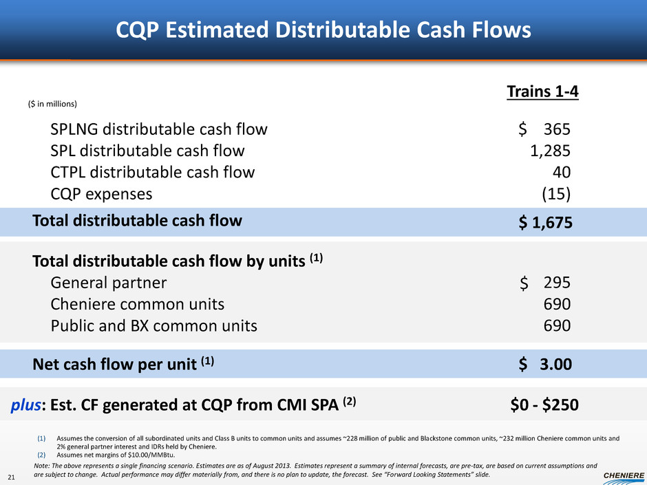 SPL Estimated Cash Flows Trains 1-4 Total Revenues BG Gas Natural KOGAS GAIL Total Centrica Commodity payments, net (1) O&M, gas procurement & other SPLNG/Total TUA Pipeline Costs EBITDA (2) 725 455 550 550 - - 275 2,555 (285) (320) (160) (765) $ 1,790 $ ($ in millions) Total Expenses (1) Assumes $6.00 / MMBtu natural gas price and that Offtakers lift 100% of their full contractual entitlement. Amounts are net of estimated natural gas to be used for the liquefaction process. (2) EBITDA is a non-GAAP measure. EBITDA is computed as total revenues less non-cash deferred revenues, operating expenses, assumed commissioning costs and state and local taxes. It does not include depreciation expenses and certain non-operating items. Because we have not forecasted depreciation expense and non-operating items, we have not made any forecast of net income, which would be the most directly comparable financial measure under GAAP, and we are unable to reconcile differences between forecasts of EBITDA and net income. EBITDA has limitations as an analytical tool and should not be considered in isolation or in lieu of an analysis of our results as reported under GAAP, and should be evaluated only on a supplementary basis. Note: The above represents a single financing scenario. Estimates are as of August 2013. Estimates represent a summary of internal forecasts, are pre-tax, are based on current assumptions and are subject to change. Actual performance may differ materially from, and there is no plan to update, the forecast. See “Forward Looking Statements” slide. Expect > 3X EBITDA: Debt Service Coverage And < 5X Debt: EBITDA 20 Trains 1-6 725 455 550 550 315 275 335 3,205 TBD TBD TBD TBD TBD $ Debt Service (505) Distributable cash flow to CQP $ 1,285 TBD TBD