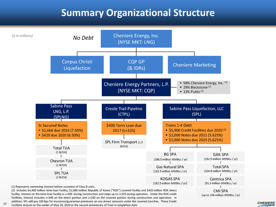 Cheniere Estimated Steady State Cash Flows (With Trains 1 – 4) ($ in millions) Net Cash Flows Cheniere Energy, Inc. Distributions from CQP Management fees CEI expenses and other 985 50 (85) 950 $ $ plus: Est. CF generated at CEI from CMI SPA (1) $0 - $1,000 (1) CMI is entitled to recover all operating costs during a year before allocating profit to SPL. Assumes net margins of up to $10.00/MMBtu, which includes cost estimates for shipping. Note: The above represents a single financing scenario. Estimates are as of August 2013. Estimates represent a summary of internal forecasts, are pre-tax, are based on current assumptions and are subject to change. Actual performance may differ materially from, and there is no plan to update, the forecast. See “Forward Looking Statements” slide. Annualized 22