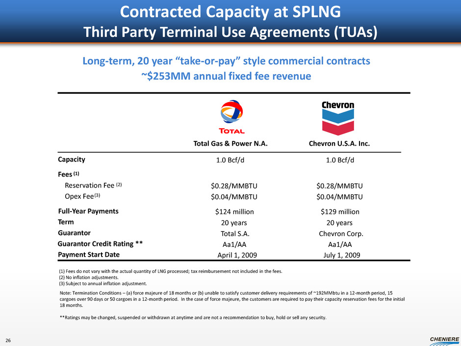 Contracted Capacity at SPLNG Third Party Terminal Use Agreements (TUAs) Long-term, 20 year “take-or-pay” style commercial contracts ~$253MM annual fixed fee revenue Total Gas & Power N.A. Chevron U.S.A. Inc. Capacity 1.0 Bcf/d 1.0 Bcf/d Fees (1) Reservation Fee (2) $0.28/MMBTU $0.28/MMBTU Opex Fee (3) $0.04/MMBTU $0.04/MMBTU Full-Year Payments $124 million $129 million Term 20 years 20 years Guarantor Total S.A. Chevron Corp. Guarantor Credit Rating ** Aa1/AA Aa1/AA Payment Start Date April 1, 2009 July 1, 2009 (1) Fees do not vary with the actual quantity of LNG processed; tax reimbursement not included in the fees. (2) No inflation adjustments. (3) Subject to annual inflation adjustment. Note: Termination Conditions – (a) force majeure of 18 months or (b) unable to satisfy customer delivery requirements of ~192MMbtu in a 12-month period, 15 cargoes over 90 days or 50 cargoes in a 12-month period. In the case of force majeure, the customers are required to pay their capacity reservation fees for the initial 18 months. **Ratings may be changed, suspended or withdrawn at anytime and are not a recommendation to buy, hold or sell any security. 26