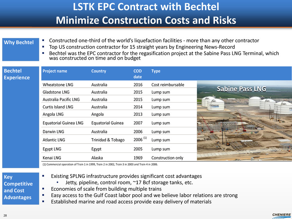 2012 2013 2014 2015 2016 2017 2018 1 2 3 4 5 6 7 8 9 10 11 12 13 14 15 16 17 18 19 20 21 22 23 24 25 26 27 28 29 30 31 32 33 34 35 36 37 38 39 40 41 42 43 44 45 46 47 48 49 50 51 52 53 54 55 56 57 58 59 60 61 62 63 64 65 66 67 68 69 70 71 72 Guaranteed Accelerated Guaranteed Accelerated Early Engineering Guaranteed Guaranteed Construction Completion Schedules Trains 1-4 Note: See “Forward Looking Statements” slide. Current plan estimates Train 1 operational in 40 months • Bechtel schedule bonus provides incentive for early delivery • Bechtel’s record delivery was Egyptian LNG train 1, delivered in 36 months from NTP Notice to Proceed for Trains 3&4 issued to Bechtel in May 2013 • Bechtel LSTK includes Guaranteed Substantial Completion dates of 48.5 and 57.5 months from NTP for Train 3 and Train 4, respectively BG DFCD GN DFCD KOGAS DFCD GAIL DFCD Record First LNG – Egyptian LNG T1 Accelerated Target – First LNG Train 1 Train 2 Train 3 Train 4 SPA CP Fulfillment Deadline Feb 2016 June 2016 Jun 2017 Mar 2018 27