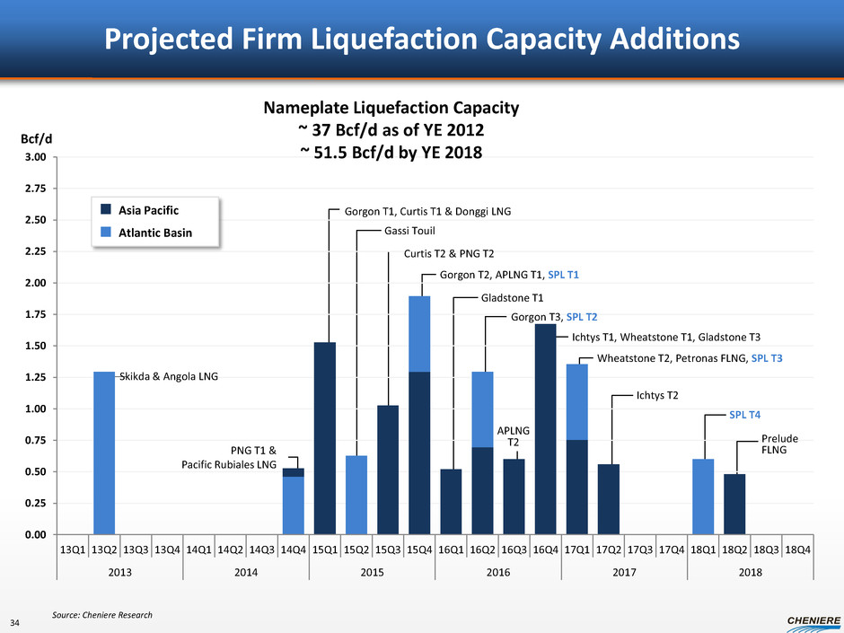 Projected Firm Liquefaction Capacity Additions 0.00 0.25 0.50 0.75 1.00 1.25 1.50 1.75 2.00 2.25 2.50 2.75 3.00 13Q1 13Q2 13Q3 13Q4 14Q1 14Q2 14Q3 14Q4 15Q1 15Q2 15Q3 15Q4 16Q1 16Q2 16Q3 16Q4 17Q1 17Q2 17Q3 17Q4 18Q1 18Q2 18Q3 18Q4 2013 2014 2015 2016 2017 2018 Asia Pacific Atlantic Basin Bcf/d Skikda & Angola LNG PNG T1 & Pacific Rubiales LNG Gorgon T1, Curtis T1 & Donggi LNG Gassi Touil Curtis T2 & PNG T2 Gorgon T2, APLNG T1, SPL T1 Gladstone T1 Gorgon T3, SPL T2 APLNG T2 Ichtys T1, Wheatstone T1, Gladstone T3 Wheatstone T2, Petronas FLNG, SPL T3 Ichtys T2 SPL T4 Prelude FLNG Nameplate Liquefaction Capacity ~ 37 Bcf/d as of YE 2012 ~ 51.5 Bcf/d by YE 2018 Source: Cheniere Research 34