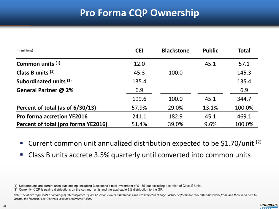 Conversion of Class B and Subordinated Units Mandatory conversion: within 90 days of the substantial completion of Train 3 Optional conversion by a Class B unitholder may occur at any of the following times: • After 83 months from issuance of EPC notice to proceed • Prior to the record date for a quarter in which sufficient cash from operating surplus is generated to distribute $0.425 to all outstanding common units and the common units to be issued upon conversion • Thirty (30) days prior to the mandatory conversion date • Within a 30-day period prior to a significant event or a dissolution Subordinated units will convert into common units on a one-for-one basis, provided that there are no cumulative common unit arrearages, and either of the below distribution hurdles is met: • For three consecutive, non-overlapping four-quarter periods, the distribution paid from “Adjusted Operating Surplus”(1) to all outstanding units(2) equals or exceeds $0.425 per quarter • For four consecutive quarters, the distribution paid from “Contracted Adjusted Operating Surplus”(1) to all outstanding units(2) equals or exceeds $0.638 per quarter 35 Class B Units: Subordinated Units: (1) As defined in CQP’s partnership agreement. (2) Includes all outstanding common units (assuming conversion of all Class B units ), subordinated units and any other outstanding units that are senior or equal in right of distribution to the subordinated units.