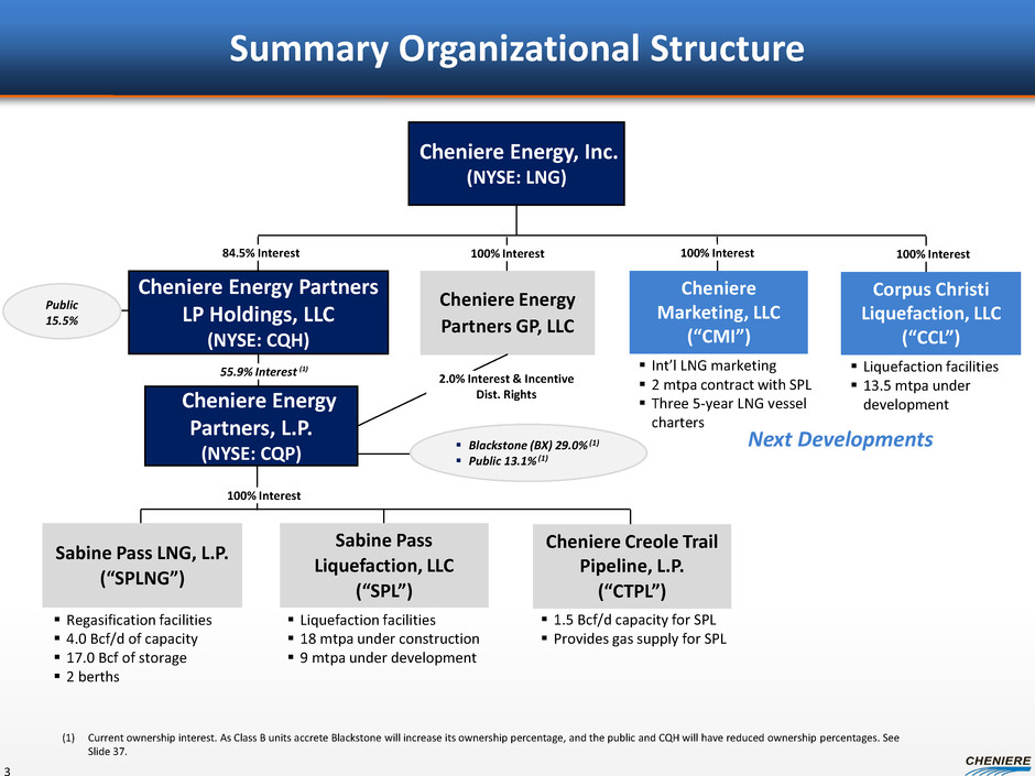 Forward Looking Statements 2 This presentation contains certain statements that are, or may be deemed to be, “forward-looking statements” within the meaning of Section 27A of the Securities Act of 1933, as amended, and Section 21E of the Securities Exchange Act of 1934, as amended. All statements, other than statements of historical facts, included herein are “forward-looking statements.” Included among “forward-looking statements” are, among other things: statements regarding the ability of Cheniere Energy Partners, L.P. to pay distributions to its unitholders or Cheniere Energy Partners LP Holdings, LLC to pay dividends to its shareholders; statements regarding Cheniere Energy Inc.’s, Cheniere Energy Partners LP Holdings, LLC’s or Cheniere Energy Partners, L.P.’s expected receipt of cash distributions from their respective subsidiaries; statements that Cheniere Energy Partners, L.P. expects to commence or complete construction of its proposed liquefaction facilities, or any expansions thereof, by certain dates or at all; statements that Cheniere Energy, Inc. expects to commence or complete construction of its proposed liquefaction facilities or other projects by certain dates or at all; statements regarding future levels of domestic and international natural gas production, supply or consumption or future levels of liquefied natural gas (“LNG”) imports into or exports from North America and other countries worldwide, regardless of the source of such information, or the transportation or demand for and prices related to natural gas, LNG or other hydrocarbon products; statements regarding any financing transactions or arrangements, or ability to enter into such transactions; statements relating to the construction of our natural gas liquefaction trains (“Trains”), or modifications to the Creole Trail Pipeline, including statements concerning the engagement of any engineering, procurement and construction ("EPC") contractor or other contractor and the anticipated terms and provisions of any agreement with any EPC or other contractor, and anticipated costs related thereto; statements regarding any agreement to be entered into or performed substantially in the future, including any revenues anticipated to be received and the anticipated timing thereof, and statements regarding the amounts of total LNG regasification, liquefaction or storage capacities that are, or may become, subject to contracts; statements regarding counterparties to our commercial contracts, construction contracts and other contracts; statements regarding our planned construction of additional Trains, including the financing of such Trains; statements that our Trains, when completed, will have certain characteristics, including amounts of liquefaction capacities; statements regarding any business strategy, our strengths, our business and operation plans or any other plans, forecasts, projections or objectives, including anticipated revenues and capital expenditures and EBITDA, any or all of which are subject to change; statements regarding projections of revenues, expenses, earnings or losses, working capital or other financial items; statements regarding legislative, governmental, regulatory, administrative or other public body actions, approvals, requirements, permits, applications, filings, investigations, proceedings or decisions; statements regarding our anticipated LNG and natural gas marketing activities; and any other statements that relate to non-historical or future information. These forward-looking statements are often identified by the use of terms and phrases such as “achieve,” “anticipate,” “believe,” “contemplate,” “develop,” “estimate,” “example,” “expect,” “forecast,” “opportunities,” “plan,” “potential,” “project,” “propose,” “subject to,” “strategy,” and similar terms and phrases, or by use of future tense. Although we believe that the expectations reflected in these forward-looking statements are reasonable, they do involve assumptions, risks and uncertainties, and these expectations may prove to be incorrect. You should not place undue reliance on these forward-looking statements, which speak only as of the date of this presentation. Our actual results could differ materially from those anticipated in these forward-looking statements as a result of a variety of factors, including those discussed in “Risk Factors” in the Cheniere Energy, Inc., Cheniere Energy Partners, L.P. and Cheniere Energy Partners LP Holdings, LLC Annual Reports on Form 10-K filed with the SEC on February 21, 2014, which are incorporated by reference into this presentation. All forward-looking statements attributable to us or persons acting on our behalf are expressly qualified in their entirety by these ”Risk Factors”. These forward-looking statements are made as of the date of this presentation, and other than as required under the securities laws, we undertake no obligation to publicly update or revise any forward- looking statements.