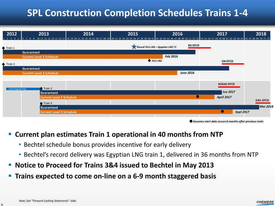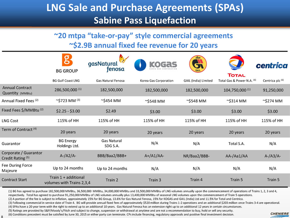 LNG Sale and Purchase Agreements (SPAs) Sabine Pass Liquefaction 8 (1) BG has agreed to purchase 182,500,000 MMBtu, 36,500,000 MMBtu, 34,000,000 MMBtu and 33,500,000 MMBtu of LNG volumes annually upon the commencement of operations of Trains 1, 2, 3 and 4, respectively. Total has agreed to purchase 91,250,000 MMBtu of LNG volumes annually plus 13,400,000 MMBtu of seasonal LNG volumes upon the commencement of Train 5 operations. (2) A portion of the fee is subject to inflation, approximately 15% for BG Group, 13.6% for Gas Natural Fenosa, 15% for KOGAS and GAIL (India) Ltd and 11.5% for Total and Centrica. (3) Following commercial in service date of Train 4. BG will provide annual fixed fees of approximately $520 million during Trains 1-2 operations and an additional $203 million once Trains 3-4 are operational. (4) SPAs have a 20 year term with the right to extend up to an additional 10 years. Gas Natural Fenosa has an extension right up to an additional 12 years in certain circumstances. (5) Ratings are provided by S&P/Moody’s/Fitch and subject to change, suspension or withdrawal at anytime and are not a recommendation to buy, hold or sell any security. (6) Conditions precedent must be satisfied by June 30, 2015 or either party can terminate. CPs include financing, regulatory approvals and positive final investment decision. BG Gulf Coast LNG Gas Natural Fenosa Annual Contract Quantity (MMBtu) 286,500,000 (1) Fixed Fees $/MMBtu (2) Annual Fixed Fees (2) ~$723 MM (3) ~$454 MM Term of Contract (4) Guarantor 20 years BG Energy Holdings Ltd. Gas Natural SDG S.A. Corporate / Guarantor Credit Rating (5) A-/A2/A- BBB/Baa2/BBB+ Fee During Force Majeure Up to 24 months Up to 24 months 20 years GAIL (India) Limited ~$548 MM 20 years NR/Baa2/BBB- N/A N/A Contract Start Train 1 + additional volumes with Trains 2,3,4 Train 2 Train 4 $2.25 - $3.00 $2.49 $3.00 182,500,000 182,500,000 20 years N/A N/A A+/A1/AA- Train 3 $3.00 ~$548 MM Korea Gas Corporation 182,500,000 ~$314 MM 20 years AA-/Aa1/AA N/A Total S.A. Train 5 $3.00 104,750,000 (1) Total Gas & Power N.A. (6) ~$274 MM 20 years A-/A3/A- N/A N/A $3.00 91,250,000 Centrica plc (6) Train 5 LNG Cost 115% of HH 115% of HH 115% of HH 115% of HH 115% of HH 115% of HH ~20 mtpa “take-or-pay” style commercial agreements ~$2.9B annual fixed fee revenue for 20 years