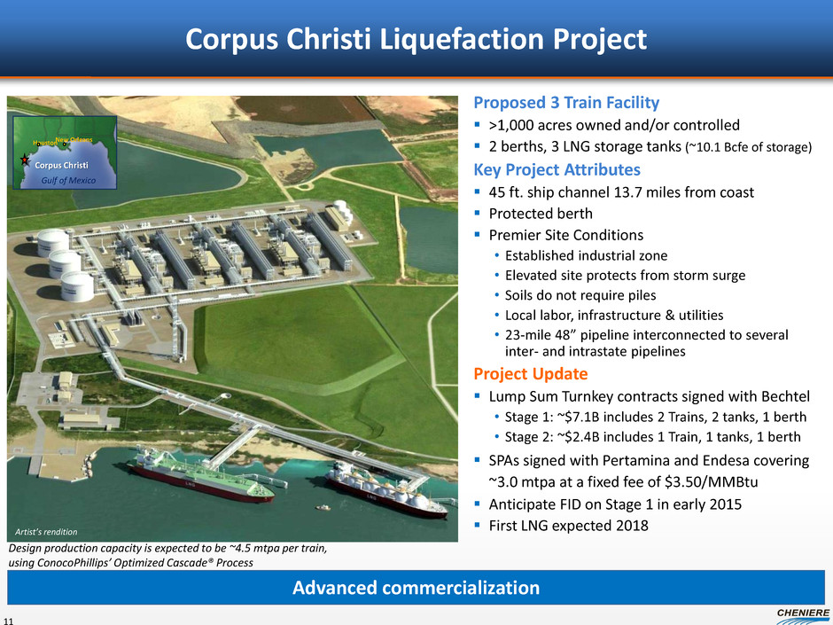 Aerial View of SPL Construction – February 2014 10 Train 2 Train 1 Train 3 Train 4 Propane Condenser Area Compressor Area Air Coolers Compressor Area Cold Box Area Propane Condenser Area Cold Box Area Train 4 Pile driving Train 3 Condenser Foundation