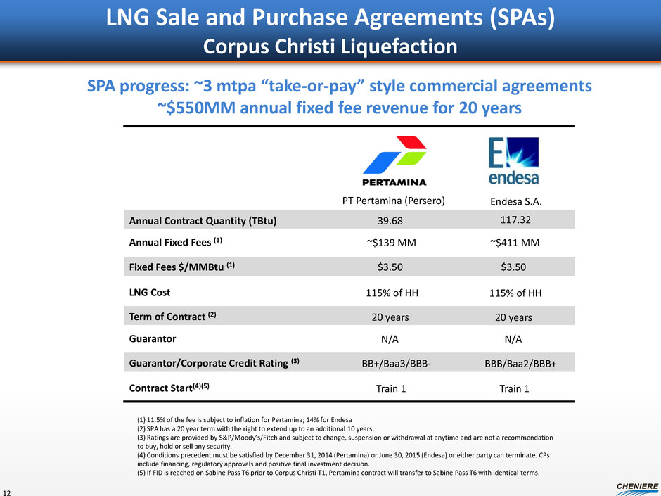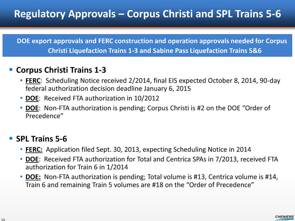 12 Annual Contract Quantity (TBtu) Fixed Fees $/MMBtu (1) Annual Fixed Fees (1) Term of Contract (2) Guarantor Guarantor/Corporate Credit Rating (3) Contract Start(4)(5) SPA progress: ~3 mtpa “take-or-pay” style commercial agreements ~$550MM annual fixed fee revenue for 20 years PT Pertamina (Persero) ~$139 MM 20 years BB+/Baa3/BBB- N/A Train 1 $3.50 39.68 (1) 11.5% of the fee is subject to inflation for Pertamina; 14% for Endesa (2) SPA has a 20 year term with the right to extend up to an additional 10 years. (3) Ratings are provided by S&P/Moody’s/Fitch and subject to change, suspension or withdrawal at anytime and are not a recommendation to buy, hold or sell any security. (4) Conditions precedent must be satisfied by December 31, 2014 (Pertamina) or June 30, 2015 (Endesa) or either party can terminate. CPs include financing, regulatory approvals and positive final investment decision. (5) If FID is reached on Sabine Pass T6 prior to Corpus Christi T1, Pertamina contract will transfer to Sabine Pass T6 with identical terms. LNG Cost 115% of HH Endesa S.A. 117.32 ~$411 MM 20 years BBB/Baa2/BBB+ N/A Train 1 $3.50 115% of HH LNG Sale and Purchase Agreements (SPAs) Corpus Christi Liquefaction