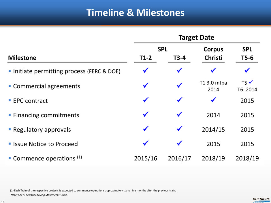 U.S. DOE Applications for LNG Exports* 15 Source: Office of Fossil Energy, U.S. Department of Energy; U.S. Federal Energy Regulatory Commission; Company releases ** Application filed = v, FERC scheduling notice issued = * As of March 31, 2014. Note additional companies have filed for their DOE license; however, not all have initiated their FERC filing process. (1) “Order of Precedence” (2) Orders are conditional on applicant completing the environmental review process as part of the FERC licensing process, and other conditions such as submitting all relevant long-term commercial agreements. (3) Application was filed for 1.4 Bcf/d; 0.4 Bcf/d was approved Expected Order to be Processed (1)2 Company Date Applicant Received FERC Approval to Begin Pre-Filing Process Quantity (Bcf/d) Date Non FTA Received FERC** Contracts Conditional (2) Final Cheniere Sabine Pass T1-T4 8/4/2010 2.8 5/20/2011 8/7/2012 Fully Subscribed Freeport LNG Expansion, L.P. and FLNG Liquefaction 1/5/2011 1.4 5/17/2013 Fully Subscribed Lake Charles Exports, LLC 4/6/2012 2 8/7/2013 v Fully Subscribed Dominion Cove Point LNG, LP 6/26/2012 1 9/11/2013 Fully Subscribed Freeport LNG Expansion, L.P. and FLNG Liquefaction 1/5/2011 0.4(3) 11/15/2013 Fully Subscribed Cameron LNG, LLC 5/9/2012 1.7 2/11/2014 Fully Subscribed Jordan Cove Energy Project, L.P. 3/6/2012 1.2/0.8 3/24/2014 v 1 LNG Development Company, LLC (d/b/a Oregon LNG) 7/16/2012 1.25 v 2 Cheniere Marketing, LLC (Corpus Christi) 12/22/2011 2.1 T1 Partially Subscribed 3 Excelerate Liquefaction Solutions 11/20/2012 1.38 v 4 Carib Energy (USA) LLC 0.03/0.01 5 Gulf Coast LNG Export, LLC 2.8 6 Southern LNG Company, L.L.C. 3/1/2013 0.5 v Fully Subscribed 7 Gulf LNG Liquefaction Company, LLC 1.5 8 CE FLNG, LLC 4/16/2013 1.07 9 Golden Pass Products LLC 5/30/2013 2.6 10 Pangea LNG (North America) Holdings, LLC 1.09 11 Trunkline LNG Export, LLC 2 12 Freeport-McMoRan Energy, LLC 3.22 13 Sabine Pass Liquefaction, LLC (T5 - Total Contract) 3/8/2013 0.28 v T5 Fully Subscribed 14 Sabine Pass Liquefaction, LLC (T5 - Centrica Contract) 3/8/2013 0.24 v T5 Fully Subscribed 15 Venture Global LNG, LLC 0.67 16 Eos LNG, LLC 1.6 17 Barca LNG, LLC 1.6 18 Sabine Pass Liquefaction, LLC (Remaining T5 Volumes and T6) 3/8/2013 0.86 v 19 Magnolia LNG, LLC 3/20/2013 1.08 20 Delfin LNG, LLC 1.8 21 Waller LNG Services, LLC 0.19 22 Gasfin Development 0.2 23 Texas LNG 0.27 24 Louisiana LNG 0.28