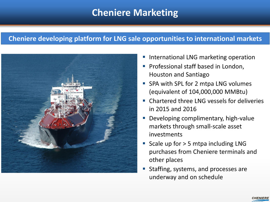 Cheniere Marketing International LNG marketing operation Professional staff based in London, Houston and Santiago SPA with SPL for 2 mtpa LNG volumes (equivalent of 104,000,000 MMBtu) Chartered three LNG vessels for deliveries in 2015 and 2016 Developing complimentary, high-value markets through small-scale asset investments Scale up for > 5 mtpa including LNG purchases from Cheniere terminals and other places Staffing, systems, and processes are underway and on schedule Cheniere developing platform for LNG sale opportunities to international markets
