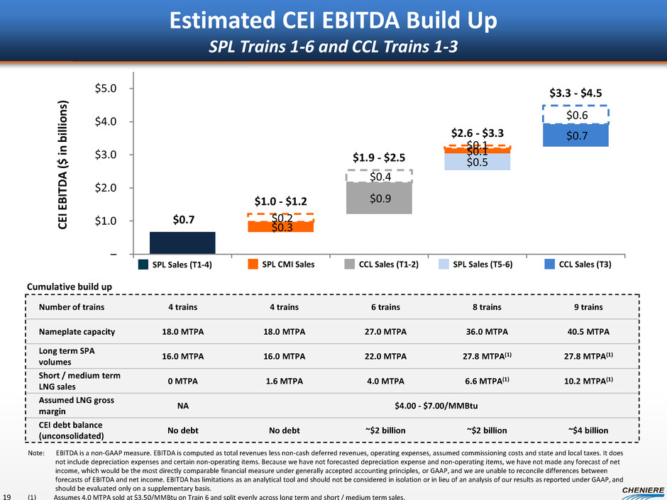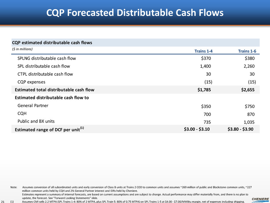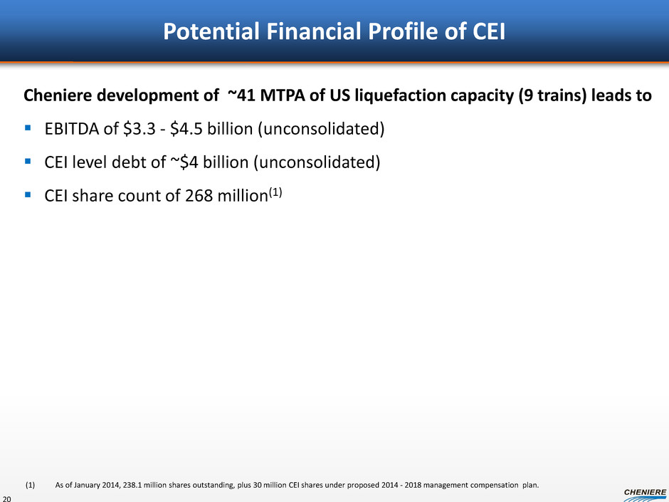 $0.3 $0.2 $0.9 $0.4 $0.5 $0.1 $0.1 $0.7 $0.6 $0.7 $1.0 - $1.2 $1.9 - $2.5 $2.6 - $3.3 $3.3 - $4.5 – $1.0 $2.0 $3.0 $4.0 $5.0 CEI EBIT DA ($ in bill ions ) Estimated CEI EBITDA Build Up SPL Trains 1-6 and CCL Trains 1-3 19 SPL Sales (T1-4) SPL CMI Sales CCL Sales (T1-2) SPL Sales (T5-6) CCL Sales (T3) Number of trains 4 trains 4 trains 6 trains 8 trains 9 trains Nameplate capacity 18.0 MTPA 18.0 MTPA 27.0 MTPA 36.0 MTPA 40.5 MTPA Long term SPA volumes 16.0 MTPA 16.0 MTPA 22.0 MTPA 27.8 MTPA(1) 27.8 MTPA(1) Short / medium term LNG sales 0 MTPA 1.6 MTPA 4.0 MTPA 6.6 MTPA(1) 10.2 MTPA(1) Assumed LNG gross margin NA $4.00 - $7.00/MMBtu CEI debt balance (unconsolidated) No debt No debt ~$2 billion ~$2 billion ~$4 billion Note: EBITDA is a non-GAAP measure. EBITDA is computed as total revenues less non-cash deferred revenues, operating expenses, assumed commissioning costs and state and local taxes. It does not include depreciation expenses and certain non-operating items. Because we have not forecasted depreciation expense and non-operating items, we have not made any forecast of net income, which would be the most directly comparable financial measure under generally accepted accounting principles, or GAAP, and we are unable to reconcile differences between forecasts of EBITDA and net income. EBITDA has limitations as an analytical tool and should not be considered in isolation or in lieu of an analysis of our results as reported under GAAP, and should be evaluated only on a supplementary basis. (1) Assumes 4.0 MTPA sold at $3.50/MMBtu on Train 6 and split evenly across long term and short / medium term sales. Cumulative build up