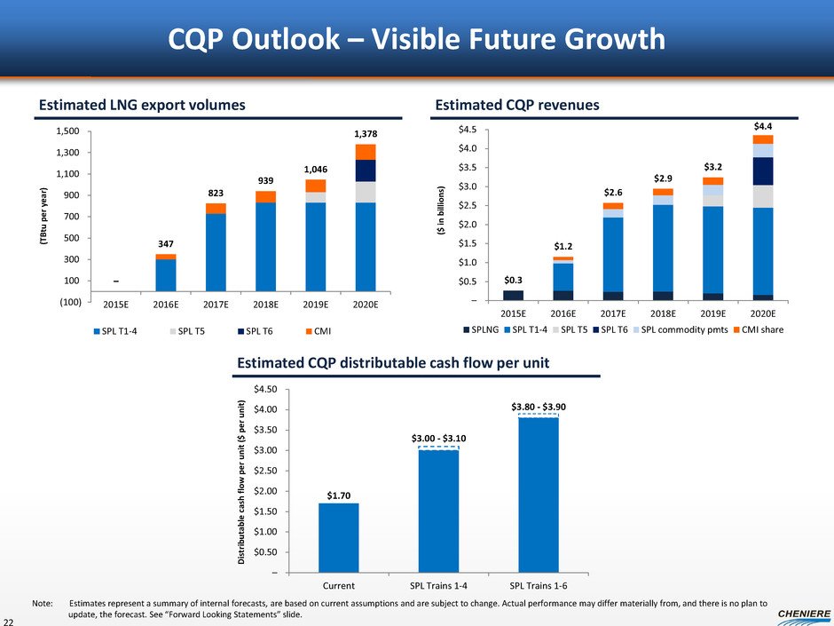 CQP estimated distributable cash flows ($ in millions) Trains 1-4 Trains 1-6 SPLNG distributable cash flow $370 $380 SPL distributable cash flow 1,400 2,260 CTPL distributable cash flow 30 30 CQP expenses (15) (15) Estimated total distributable cash flow $1,785 $2,655 Estimated distributable cash flow to General Partner $350 $750 CQH 700 870 Public and BX units 735 1,035 Estimated range of DCF per unit (1) $3.00 - $3.10 $3.80 - $3.90 CQP Forecasted Distributable Cash Flows 21 Note: Assumes conversion of all subordinated units and early conversion of Class B units at Trains 2 COD to common units and assumes ~269 million of public and Blackstone common units, ~227 million common units held by CQH and 2% General Partner interest and IDRs held by Cheniere. Estimates represent a summary of internal forecasts, are based on current assumptions and are subject to change. Actual performance may differ materially from, and there is no plan to update, the forecast. See “Forward Looking Statements” slide. (1) Assumes CMI sells 2.2 MTPA (SPL Trains 1-4: 80% of 2 MTPA, plus SPL Train 5: 80% of 0.75 MTPA) on SPL Trains 1-5 at $4.00 - $7.00/MMBtu margin, net of expenses including shipping.