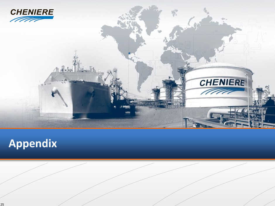 Cheniere’s Debt Summary As of March 2014 24 Cheniere Energy, Inc. (NYSE: LNG) Cheniere Energy Partners, L.P. (NYSE: CQP) Sabine Pass LNG, L.P. (SPLNG) BG SPA (286.5 million MMBtu / yr) Gas Natural SPA (182.5 million MMBtu / yr) KOGAS SPA (182.5 million MMBtu / yr) GAIL SPA (182.5 million MMBtu / yr) Total TUA (1 Bcf/d) Chevron TUA (1 Bcf/d) SPL TUA (2 Bcf/d) Sr Secured Notes $1,666 due 2016 (7.50%) $420 due 2020 (6.50%) ($ in millions) No Debt Cheniere Marketing, LLC Corpus Christi Liquefaction, LLC Trains 1-4 Debt $5,015 Credit Facilities due 2020 (1) $2,000 Notes due 2021 (5.625%) $1,000 Notes due 2022 (6.250%) $1,000 Notes due 2023 (5.625%) CMI SPA (up to 104 million MMBtu / yr) Total SPA (104.8 million MMBtu / yr) Sabine Pass Liquefaction, LLC (SPL) Centrica SPA (91.3 million MMBtu / yr) Creole Trail Pipeline (CTPL) SPL Firm Transport (1.5 Bcf/d) $400 Term Loan due 2017 (L+325) CQP GP (& IDRs) (1) Includes $3,740 million term loan facility, $918 million Republic of Korea (“ROK”) covered facility and $357 million ROK direct facility. Interest on the term loan facility is L+300 during construction and steps up to L+325 during operation. Under the ROK credit facilities, interest includes L+300 on the direct portion and L+230 on the covered portion during construction and operation. In addition, SPL will pay 100 bps for insurance/guarantee premiums on any drawn amounts under the covered tranches. These Credit Facilities mature on the earlier of May 28, 2020 or the second anniversary of Train 4 completion date. $100 million has been drawn to date. Cheniere Energy Partners LP Holdings, LLC (NYSE: CQH) No Debt