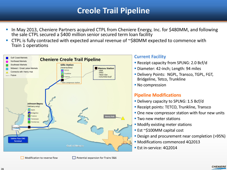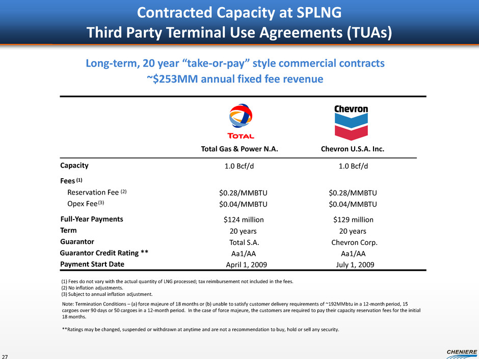 Contracted Capacity at SPLNG Third Party Terminal Use Agreements (TUAs) 27 Long-term, 20 year “take-or-pay” style commercial contracts ~$253MM annual fixed fee revenue Total Gas & Power N.A. Chevron U.S.A. Inc. Capacity 1.0 Bcf/d 1.0 Bcf/d Fees (1) Reservation Fee (2) $0.28/MMBTU $0.28/MMBTU Opex Fee (3) $0.04/MMBTU $0.04/MMBTU Full-Year Payments $124 million $129 million Term 20 years 20 years Guarantor Total S.A. Chevron Corp. Guarantor Credit Rating ** Aa1/AA Aa1/AA Payment Start Date April 1, 2009 July 1, 2009 (1) Fees do not vary with the actual quantity of LNG processed; tax reimbursement not included in the fees. (2) No inflation adjustments. (3) Subject to annual inflation adjustment. Note: Termination Conditions – (a) force majeure of 18 months or (b) unable to satisfy customer delivery requirements of ~192MMbtu in a 12-month period, 15 cargoes over 90 days or 50 cargoes in a 12-month period. In the case of force majeure, the customers are required to pay their capacity reservation fees for the initial 18 months. **Ratings may be changed, suspended or withdrawn at anytime and are not a recommendation to buy, hold or sell any security.
