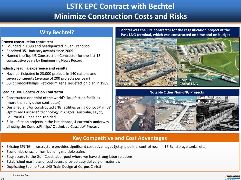 Creole Trail Pipeline Current Facility Receipt capacity from SPLNG: 2.0 Bcf/d Diameter: 42-inch; Length: 94 miles Delivery Points: NGPL, Transco, TGPL, FGT, Bridgeline, Tetco, Trunkline No compression Pipeline Modifications Delivery capacity to SPLNG: 1.5 Bcf/d Receipt points: TETCO, Trunkline, Transco One new compressor station with four new units Two new meter stations Modify existing meter stations Est ~$100MM capital cost Design and procurement near completion (>95%) Modifications commenced 4Q2013 Est in-service: 4Q2014 28 In May 2013, Cheniere Partners acquired CTPL from Cheniere Energy, Inc. for $480MM, and following the sale CTPL secured a $400 million senior secured term loan facility CTPL is fully contracted with expected annual revenue of ~$80MM expected to commence with Train 1 operations Potential expansion for Trains 5&6 Modification to reverse flow