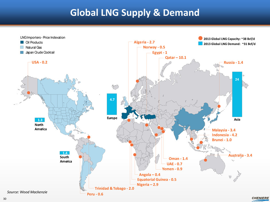 Global LNG Supply & Demand 2013 Global LNG Capacity: ~38 Bcf/d Natural Gas Oil Products LNG Importers - Price Indexation Japan Crude Cocktail 2013 Global LNG Demand: ~31 Bcf/d No r th Ame r ica S outh Ame r ica E u r ope A sia 4.7 1.3 1.4 24 A ust r alia - 3.4 B r unei - 1.0 Indonesia - 4.2 M al a y sia - 3.4 A lge r ia - 2.7 N o r w a y - 0.5 Q a tar – 10.1 Russia - 1.4 Egypt - 1 Y emen - 0.9 Nigeria – 2.9 T r inidad & T obago - 2.0 Equatorial Guinea - 0.5 Oman - 1.4 U AE - 0.7 USA - 0.2 P e r u - 0.6 Source: Wood Mackenzie 30 Angola – 0.4