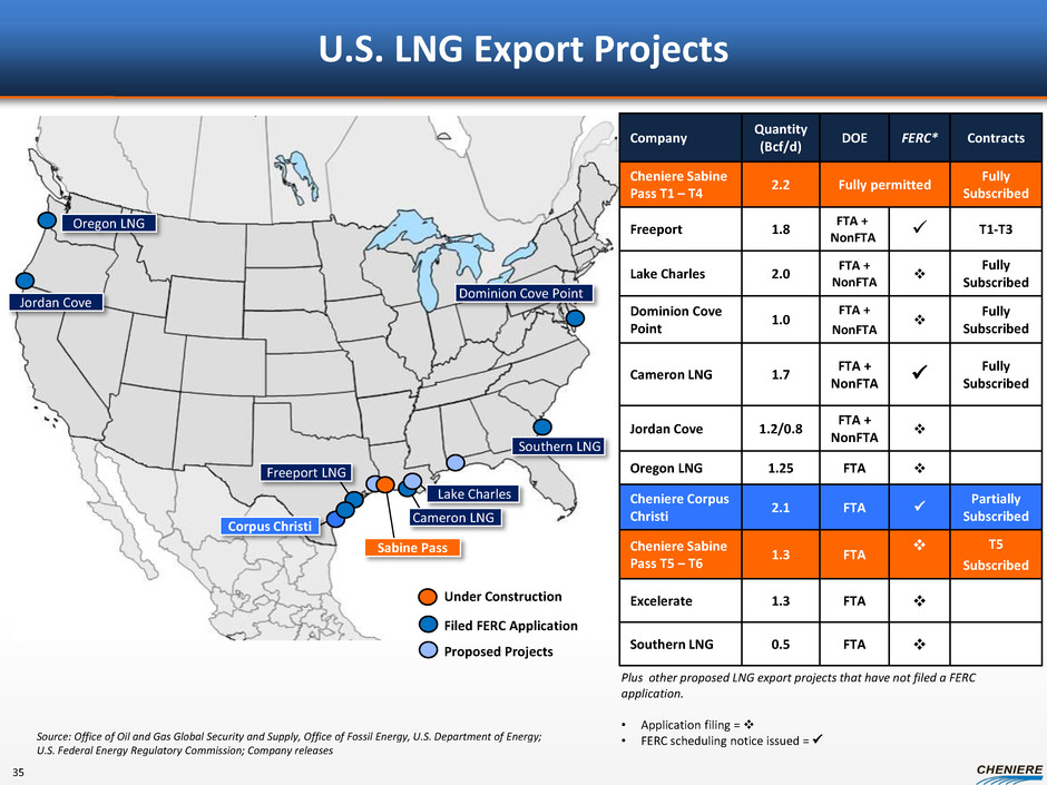 Multiple Local Pipeline Interconnections Provide Several Options for Access to Natural Gas Supply 34 Targa Columbia Gulf Tennessee Cheniere Creole Trail Pipeline Trunkline Kinder Morgan Louisiana Pipeline NGPL Texas to Louisiana (bi-directional) Transco TETCO Tennessee FGT ) Existing Pipeline Grid Transco Z3 Sabine Pine Prairie Energy Center Egan Storage Jefferson Island Storage Pine Prairie Texas Gas ANR Florida Gas Z2 Tennessee Trunkline Columbia NGPL Transco Florida Gas Z1 Tennessee Bridgeline . NGPL Texas Eastern Trunkline Transco Z3 Source: Cheniere Research