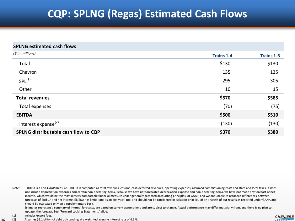 SPLNG estimated cash flows ($ in millions) Trains 1-4 Trains 1-6 Total $130 $130 Chevron 135 135 SPL (1) 295 305 Other 10 15 Total revenues $570 $585 Total expenses (70) (75) EBITDA $500 $510 Interest expense(2) (130) (130) SPLNG distributable cash flow to CQP $370 $380 CQP: SPLNG (Regas) Estimated Cash Flows 36 Note: EBITDA is a non-GAAP measure. EBITDA is computed as total revenues less non-cash deferred revenues, operating expenses, assumed commissioning costs and state and local taxes. It does not include depreciation expenses and certain non-operating items. Because we have not forecasted depreciation expense and non-operating items, we have not made any forecast of net income, which would be the most directly comparable financial measure under generally accepted accounting principles, or GAAP, and we are unable to reconcile differences between forecasts of EBITDA and net income. EBITDA has limitations as an analytical tool and should not be considered in isolation or in lieu of an analysis of our results as reported under GAAP, and should be evaluated only on a supplementary basis. Estimates represent a summary of internal forecasts, are based on current assumptions and are subject to change. Actual performance may differ materially from, and there is no plan to update, the forecast. See “Forward Looking Statements” slide. (1) Includes export fees. (2) Assumes $2.1 billion of debt outstanding at a weighted average interest rate of 6.3%.