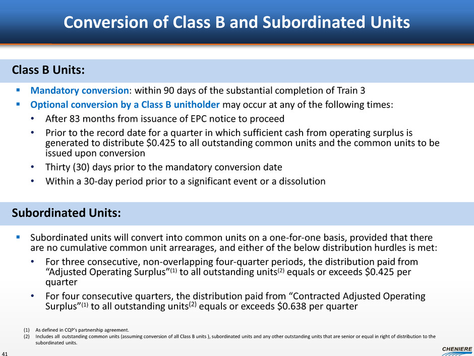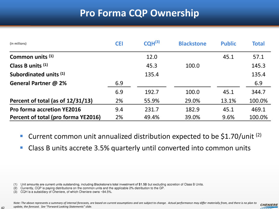 Conversion of Class B and Subordinated Units 41 Mandatory conversion: within 90 days of the substantial completion of Train 3 Optional conversion by a Class B unitholder may occur at any of the following times: • After 83 months from issuance of EPC notice to proceed • Prior to the record date for a quarter in which sufficient cash from operating surplus is generated to distribute $0.425 to all outstanding common units and the common units to be issued upon conversion • Thirty (30) days prior to the mandatory conversion date • Within a 30-day period prior to a significant event or a dissolution Subordinated units will convert into common units on a one-for-one basis, provided that there are no cumulative common unit arrearages, and either of the below distribution hurdles is met: • For three consecutive, non-overlapping four-quarter periods, the distribution paid from “Adjusted Operating Surplus”(1) to all outstanding units(2) equals or exceeds $0.425 per quarter • For four consecutive quarters, the distribution paid from “Contracted Adjusted Operating Surplus”(1) to all outstanding units(2) equals or exceeds $0.638 per quarter Class B Units: Subordinated Units: (1) As defined in CQP’s partnership agreement. (2) Includes all outstanding common units (assuming conversion of all Class B units ), subordinated units and any other outstanding units that are senior or equal in right of distribution to the subordinated units.