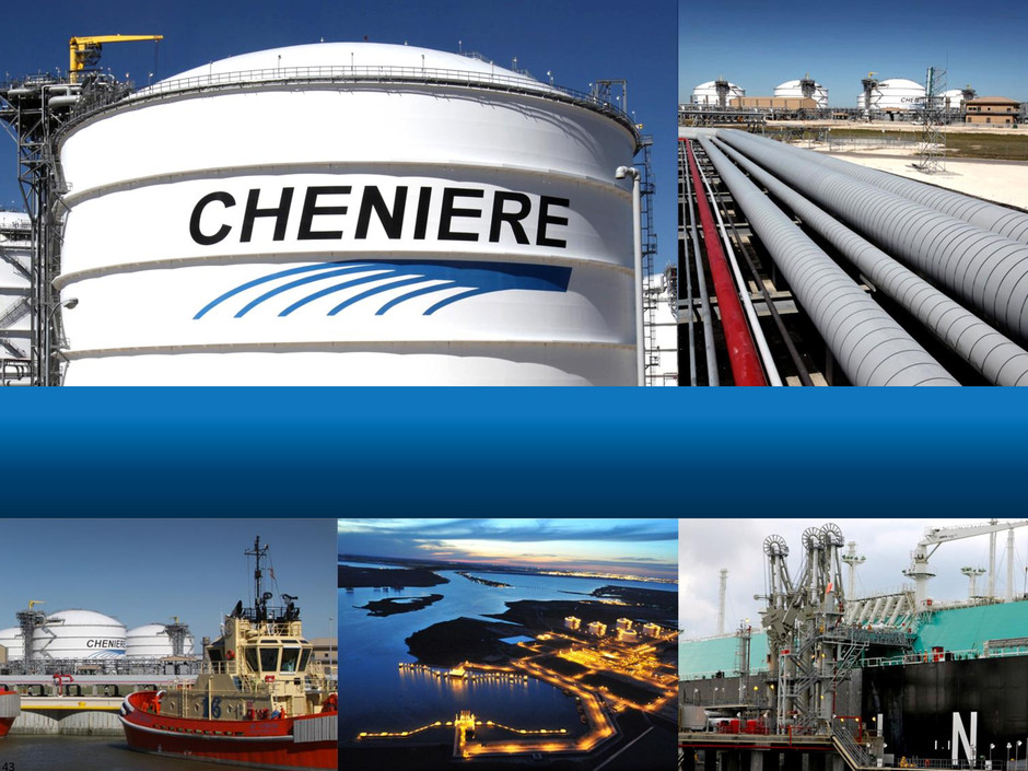 Pro Forma CQP Ownership 42 Current common unit annualized distribution expected to be $1.70/unit (2) Class B units accrete 3.5% quarterly until converted into common units (1) Unit amounts are current units outstanding, including Blackstone’s total investment of $1.5B but excluding accretion of Class B Units. (2) Currently, CQP is paying distributions on the common units and the applicable 2% distribution to the GP. (3) CQH is a subsidiary of Cheniere, of which Cheniere owns ~84.5%. Note: The above represents a summary of internal forecasts, are based on current assumptions and are subject to change. Actual performance may differ materially from, and there is no plan to update, the forecast. See “Forward Looking Statements” slide. (in millions) CEI CQH(3) Blackstone Public Total Common units (1) 12.0 45.1 57.1 Class B units (1) 45.3 100.0 145.3 Subordinated units (1) 135.4 135.4 General Partner @ 2% 6.9 6.9 6.9 192.7 100.0 45.1 344.7 Percent of total (as of 12/31/13) 2% 55.9% 29.0% 13.1% 100.0% Pro forma accretion YE2016 9.4 231.7 182.9 45.1 469.1 Percent of total (pro forma YE2016) 2% 49.4% 39.0% 9.6% 100.0%