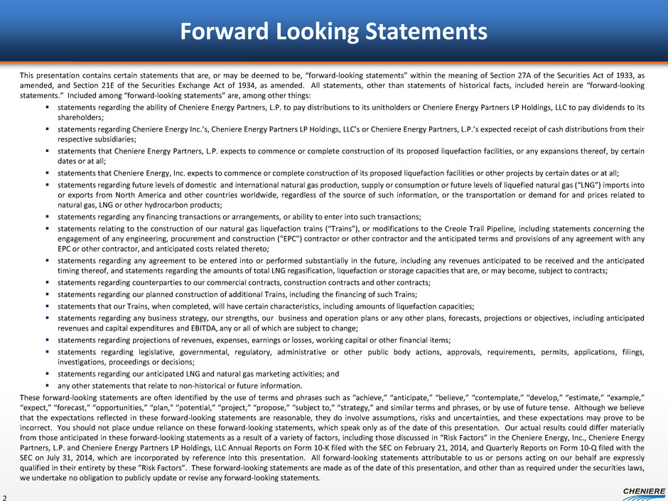 Forward Looking Statements 2 This presentation contains certain statements that are, or may be deemed to be, “forward-looking statements” within the meaning of Section 27A of the Securities Act of 1933, as amended, and Section 21E of the Securities Exchange Act of 1934, as amended. All statements, other than statements of historical facts, included herein are “forward-looking statements.” Included among “forward-looking statements” are, among other things: statements regarding the ability of Cheniere Energy Partners, L.P. to pay distributions to its unitholders or Cheniere Energy Partners LP Holdings, LLC to pay dividends to its shareholders; statements regarding Cheniere Energy Inc.’s, Cheniere Energy Partners LP Holdings, LLC’s or Cheniere Energy Partners, L.P.’s expected receipt of cash distributions from their respective subsidiaries; statements that Cheniere Energy Partners, L.P. expects to commence or complete construction of its proposed liquefaction facilities, or any expansions thereof, by certain dates or at all; statements that Cheniere Energy, Inc. expects to commence or complete construction of its proposed liquefaction facilities or other projects by certain dates or at all; statements regarding future levels of domestic and international natural gas production, supply or consumption or future levels of liquefied natural gas (“LNG”) imports into or exports from North America and other countries worldwide, regardless of the source of such information, or the transportation or demand for and prices related to natural gas, LNG or other hydrocarbon products; statements regarding any financing transactions or arrangements, or ability to enter into such transactions; statements relating to the construction of our natural gas liquefaction trains (“Trains”), or modifications to the Creole Trail Pipeline, including statements concerning the engagement of any engineering, procurement and construction ("EPC") contractor or other contractor and the anticipated terms and provisions of any agreement with any EPC or other contractor, and anticipated costs related thereto; statements regarding any agreement to be entered into or performed substantially in the future, including any revenues anticipated to be received and the anticipated timing thereof, and statements regarding the amounts of total LNG regasification, liquefaction or storage capacities that are, or may become, subject to contracts; statements regarding counterparties to our commercial contracts, construction contracts and other contracts; statements regarding our planned construction of additional Trains, including the financing of such Trains; statements that our Trains, when completed, will have certain characteristics, including amounts of liquefaction capacities; statements regarding any business strategy, our strengths, our business and operation plans or any other plans, forecasts, projections or objectives, including anticipated revenues and capital expenditures and EBITDA, any or all of which are subject to change; statements regarding projections of revenues, expenses, earnings or losses, working capital or other financial items; statements regarding legislative, governmental, regulatory, administrative or other public body actions, approvals, requirements, permits, applications, filings, investigations, proceedings or decisions; statements regarding our anticipated LNG and natural gas marketing activities; and any other statements that relate to non-historical or future information. These forward-looking statements are often identified by the use of terms and phrases such as “achieve,” “anticipate,” “believe,” “contemplate,” “develop,” “estimate,” “example,” “expect,” “forecast,” “opportunities,” “plan,” “potential,” “project,” “propose,” “subject to,” “strategy,” and similar terms and phrases, or by use of future tense. Although we believe that the expectations reflected in these forward-looking statements are reasonable, they do involve assumptions, risks and uncertainties, and these expectations may prove to be incorrect. You should not place undue reliance on these forward-looking statements, which speak only as of the date of this presentation. Our actual results could differ materially from those anticipated in these forward-looking statements as a result of a variety of factors, including those discussed in “Risk Factors” in the Cheniere Energy, Inc., Cheniere Energy Partners, L.P. and Cheniere Energy Partners LP Holdings, LLC Annual Reports on Form 10-K filed with the SEC on February 21, 2014, and Quarterly Reports on Form 10-Q filed with the SEC on July 31, 2014, which are incorporated by reference into this presentation. All forward-looking statements attributable to us or persons acting on our behalf are expressly qualified in their entirety by these ”Risk Factors”. These forward-looking statements are made as of the date of this presentation, and other than as required under the securities laws, we undertake no obligation to publicly update or revise any forward-looking statements.