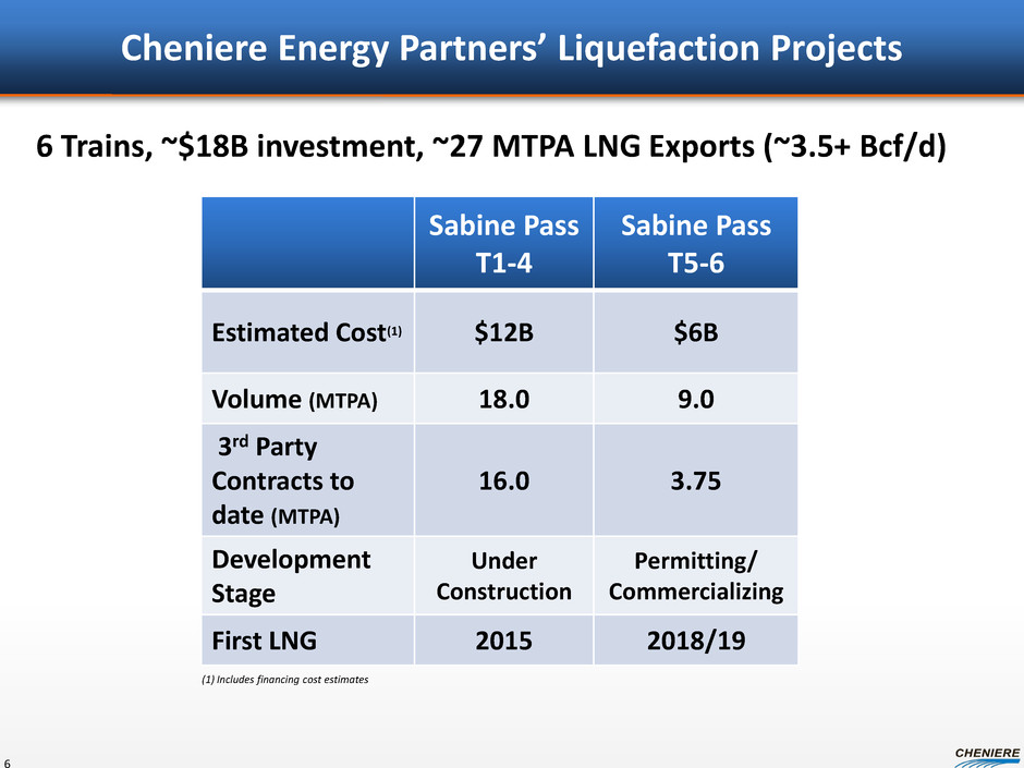Cheniere’s LNG Export Facilities Offer Attractive Pricing for Global LNG Buyers 5 Example Prices Henry Hub: $4.00 / MMBtu Brent Crude: $100 / Barrel ($/MMBtu) Americas Europe Asia LNG Cost (1) 4.60 $ 4.60 4.60 Shipping 0.50 1.00 3.00 $ 8.60 9.10 11.10 3.90 LNG Price (% Crude) @ 15% 15.00 12.00 15.00 Net Difference 6.40 $ 2.90 Liquefaction Fee 3.50 3.50 3.50 Delivered Cost Source: Pira, Cheniere Research estimates Japan spot data sourced from METI post March 2014 @ 12% @ 15% $ $ $ $ $ $ (1) LNG Cost is calculated as 115% of Henry Hub price. Worldwide LNG Prices = 11% to 15% of Crude Oil $4.55 $6.65 $14.80 $10.59 0 2 4 6 8 10 12 14 16 18 20 J a n -1 0 A p r- 1 0 Jul -1 0 O ct -1 0 J a n -1 1 A p r- 1 1 Jul -1 1 O ct -1 1 J a n -1 2 A p r- 1 2 Jul -1 2 O ct -1 2 J a n -1 3 A p r- 1 3 Jul -1 3 O ct -1 3 J a n -1 4 A p r- 1 4 Jul -1 4 $/MMBtu Regional Natural Gas & LNG Prices July 2014 NBP NYMEX European Gas Contract Japan Spot