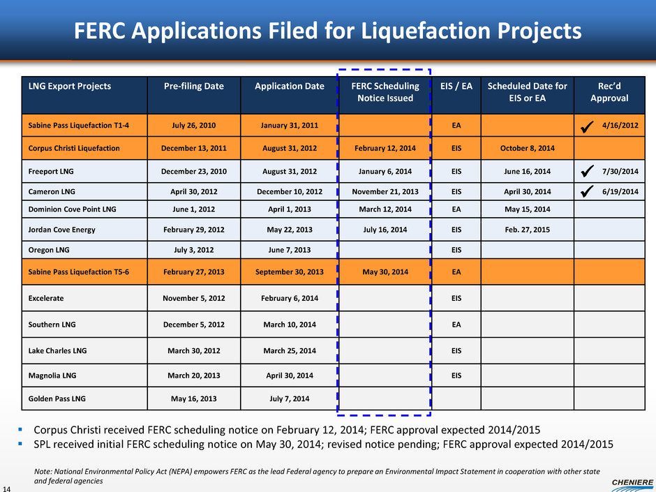 FERC Applications Filed for Liquefaction Projects Corpus Christi received FERC scheduling notice on February 12, 2014; FERC approval expected 2014/2015 SPL received initial FERC scheduling notice on May 30, 2014; revised notice pending; FERC approval expected 2014/2015 14 LNG Export Projects Pre-filing Date Application Date FERC Scheduling Notice Issued EIS / EA Scheduled Date for EIS or EA Rec’d Approval Sabine Pass Liquefaction T1-4 July 26, 2010 January 31, 2011 EA 4/16/2012 Corpus Christi Liquefaction December 13, 2011 August 31, 2012 February 12, 2014 EIS October 8, 2014 Freeport LNG December 23, 2010 August 31, 2012 January 6, 2014 EIS June 16, 2014 7/30/2014 Cameron LNG April 30, 2012 December 10, 2012 November 21, 2013 EIS April 30, 2014 6/19/2014 Dominion Cove Point LNG June 1, 2012 April 1, 2013 March 12, 2014 EA May 15, 2014 Jordan Cove Energy February 29, 2012 May 22, 2013 July 16, 2014 EIS Feb. 27, 2015 Oregon LNG July 3, 2012 June 7, 2013 EIS Sabine Pass Liquefaction T5-6 February 27, 2013 September 30, 2013 May 30, 2014 EA Excelerate November 5, 2012 February 6, 2014 EIS Southern LNG December 5, 2012 March 10, 2014 EA Lake Charles LNG March 30, 2012 March 25, 2014 EIS Magnolia LNG March 20, 2013 April 30, 2014 EIS Golden Pass LNG May 16, 2013 July 7, 2014 Note: National Environmental Policy Act (NEPA) empowers FERC as the lead Federal agency to prepare an Environmental Impact Statement in cooperation with other state and federal agencies