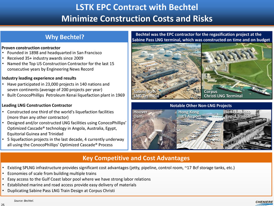 Creole Trail Pipeline Current Facility Receipt capacity from SPLNG: 2.0 Bcf/d Diameter: 42-inch; Length: 94 miles Delivery Points: NGPL, Transco, TGPL, FGT, Bridgeline, Tetco, Trunkline No compression Pipeline Modifications Delivery capacity to SPLNG: 1.5 Bcf/d Receipt points: TETCO, Trunkline, Transco One new compressor station with four new units Two new meter stations Modify existing meter stations Est ~$100MM capital cost Design and procurement near completion (>95%) Modifications commenced 4Q2013 Est in-service: 4Q2014 24 In May 2013, Cheniere Partners acquired CTPL from Cheniere Energy, Inc. for $480MM, and following the sale CTPL secured a $400 million senior secured term loan facility CTPL is fully contracted with expected annual revenue of ~$80MM expected to commence with Train 1 operations Potential expansion for Trains 5&6 Modification to reverse flow