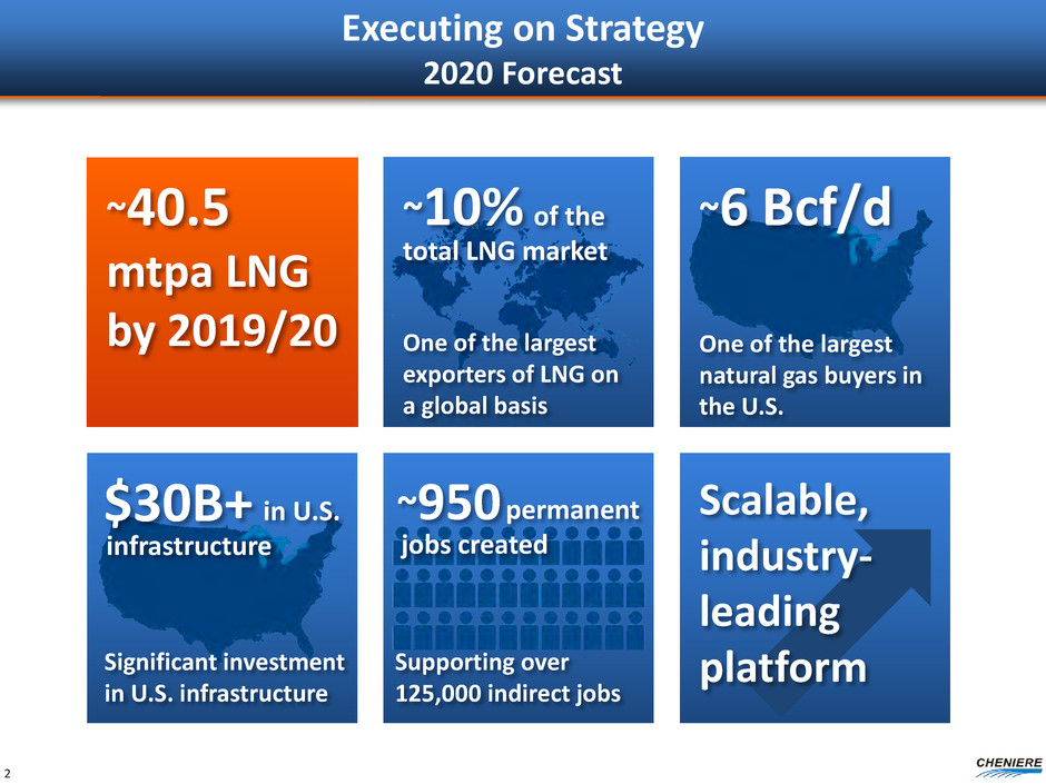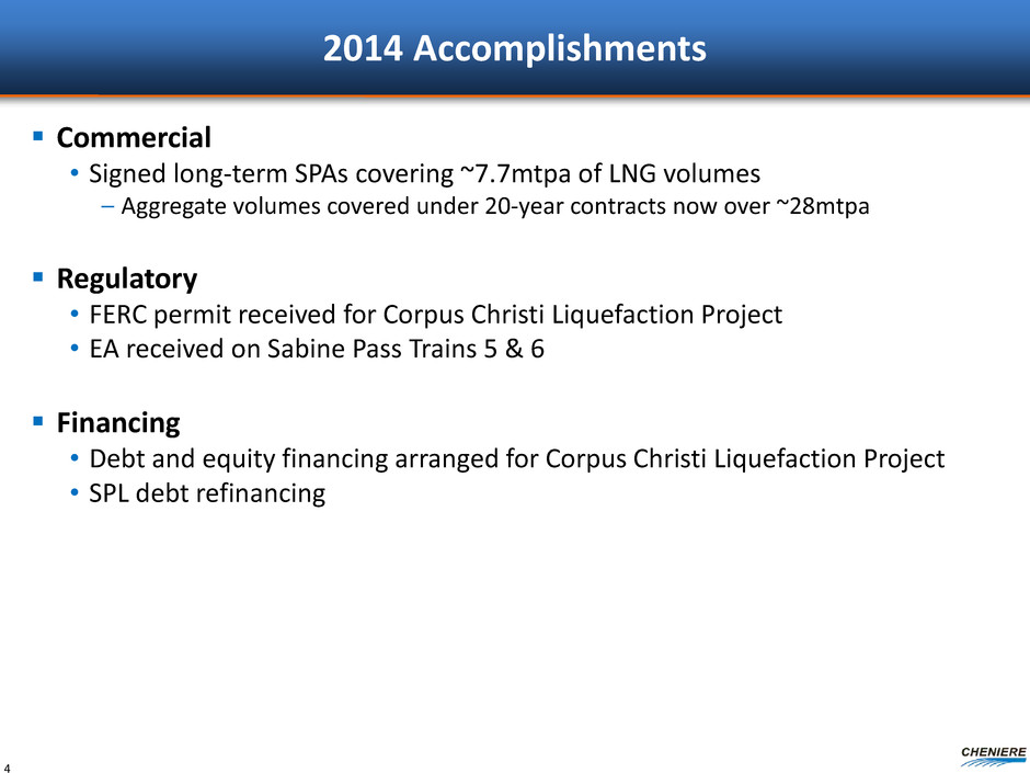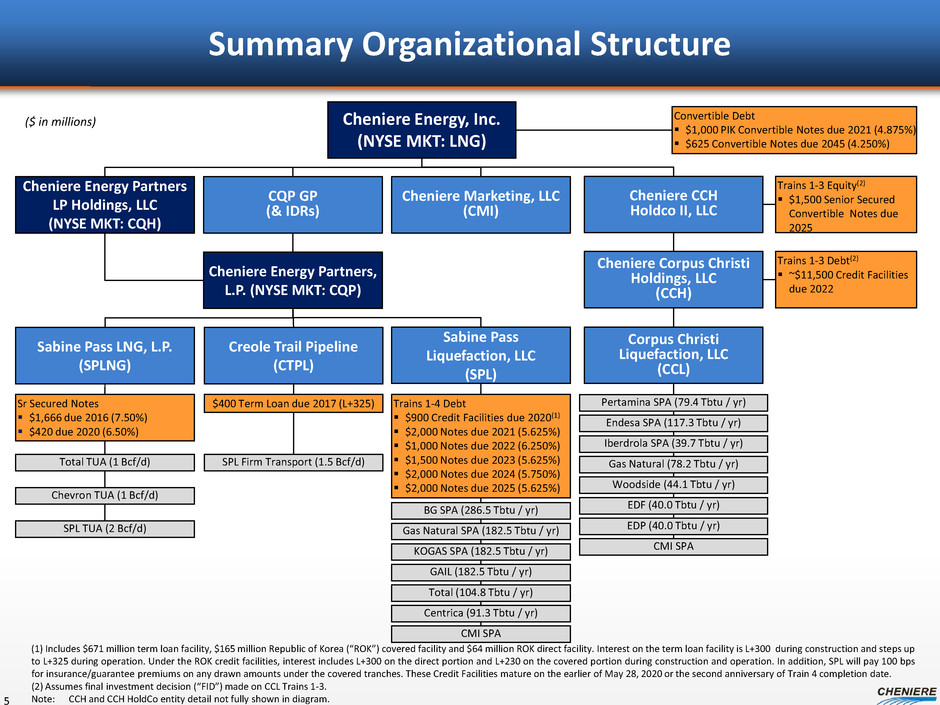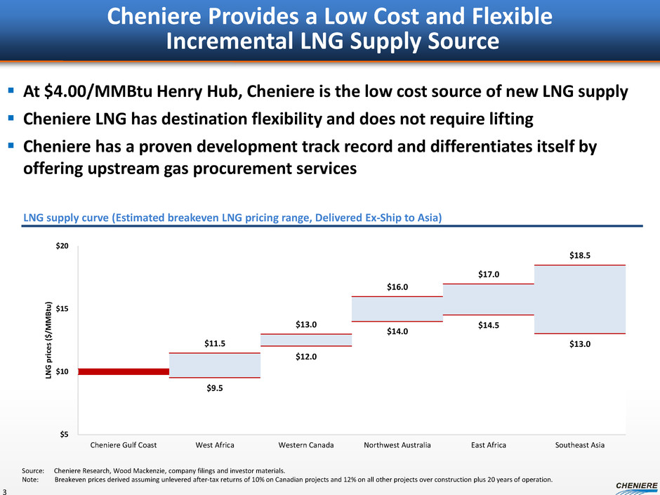 Forward Looking Statements 2 This presentation contains certain statements that are, or may be deemed to be, “forward-looking statements” within the meaning of Section 27A of the Securities Act of 1933, as amended, and Section 21E of the Securities Exchange Act of 1934, as amended. All statements, other than statements of historical facts, included herein are “forward-looking statements.” Included among “forward-looking statements” are, among other things: statements regarding the ability of Cheniere Energy Partners, L.P. to pay distributions to its unitholders or Cheniere Energy Partners LP Holdings, LLC to pay dividends to its shareholders; statements regarding Cheniere Energy Inc.’s, Cheniere Energy Partners LP Holdings, LLC’s or Cheniere Energy Partners, L.P.’s expected receipt of cash distributions from their respective subsidiaries; statements that Cheniere Energy Partners, L.P. expects to commence or complete construction of its proposed liquefied natural gas (“LNG”) terminals, liquefaction facilities, pipeline facilities or other projects, or any expansions thereof, by certain dates or at all; statements that Cheniere Energy, Inc. expects to commence or complete construction of its proposed LNG terminals, liquefaction facilities, pipeline facilities or other projects by certain dates or at all; statements regarding future levels of domestic and international natural gas production, supply or consumption or future levels of LNG imports into or exports from North America and other countries worldwide, or purchases of natural gas, regardless of the source of such information, or the transportation or other infrastructure, or demand for and prices related to natural gas, LNG or other hydrocarbon products; statements regarding any financing transactions or arrangements, or ability to enter into such transactions; statements relating to the construction of our proposed liquefaction facilities and natural gas liquefaction trains (“Trains”), or modifications to the Creole Trail Pipeline, including statements concerning the engagement of any engineering, procurement and construction ("EPC") contractor or other contractor and the anticipated terms and provisions of any agreement with any EPC or other contractor, and anticipated costs related thereto; statements regarding any agreement to be entered into or performed substantially in the future, including any revenues anticipated to be received and the anticipated timing thereof, and statements regarding the amounts of total LNG regasification, liquefaction or storage capacities that are, or may become, subject to contracts; statements regarding counterparties to our commercial contracts, construction contracts and other contracts; statements regarding our planned construction of additional Trains, including the financing of such Trains; statements that our Trains, when completed, will have certain characteristics, including amounts of liquefaction capacities; statements regarding our business strategy, our strengths, our business and operation plans or any other plans, forecasts, projections or objectives, including anticipated revenues and capital expenditures and EBITDA, any or all of which are subject to change; statements regarding projections of revenues, expenses, earnings or losses, working capital or other financial items; statements regarding legislative, governmental, regulatory, administrative or other public body actions, approvals, requirements, permits, applications, filings, investigations, proceedings or decisions; statements regarding our anticipated LNG and natural gas marketing activities; and any other statements that relate to non-historical or future information. These forward-looking statements are often identified by the use of terms and phrases such as “achieve,” “anticipate,” “believe,” “contemplate,” “develop,” “estimate,” “example,” “expect,” “forecast,” “goal,” “opportunities,” “plan,” “potential,” “project,” “propose,” “subject to,” “strategy,” “target,” and similar terms and phrases, or by use of future tense. Although we believe that the expectations reflected in these forward-looking statements are reasonable, they do involve assumptions, risks and uncertainties, and these expectations may prove to be incorrect. You should not place undue reliance on these forward-looking statements, which speak only as of the date of this presentation. Our actual results could differ materially from those anticipated in these forward-looking statements as a result of a variety of factors, including those discussed in “Risk Factors” in the Cheniere Energy, Inc., Cheniere Energy Partners, L.P. and Cheniere Energy Partners LP Holdings, LLC Annual Reports on Form 10-K filed with the SEC on February 20, 2015, which are incorporated by reference into this presentation. All forward-looking statements attributable to us or persons acting on our behalf are expressly qualified in their entirety by these ”Risk Factors.” These forward-looking statements are made as of the date of this presentation, and other than as required under the securities laws, we undertake no obligation to publicly update or revise any forward-looking statements.