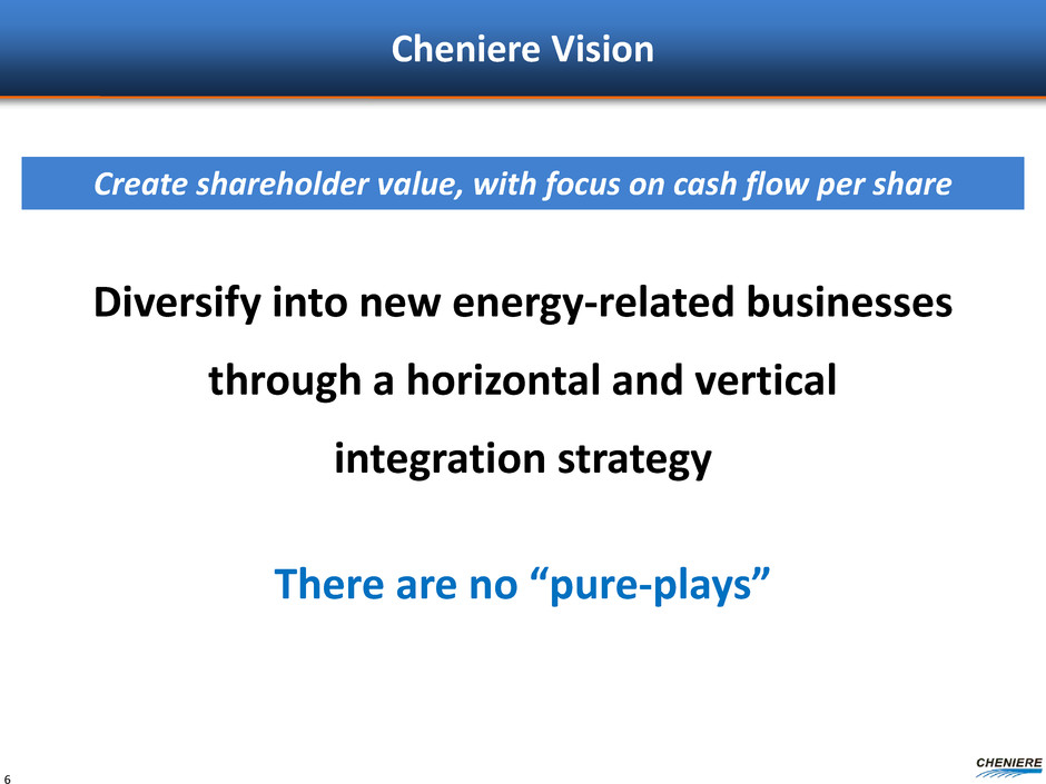 Estimated CEI EBITDA per Share 5 Projects evaluated with an emphasis on cash flows 9 Liquefaction Trains ~$15 11 Liquefaction Trains Initiating process to develop additional trains ~$20 Targeting Future Growth (2020) Other hydrocarbon exports Infrastructure development/acquisitions International projects Small-scale LNG projects ~$30(1) Note: See “Forward Looking Statements” Slide EBITDA per share is a non-GAAP measure. We have not made any forecast of net income, which would be the most comparable financial measure under GAAP, and we are unable to reconcile differences between forecasted EBITDA and net income. EBITDA has limitations as an analytical tool and should not be considered in isolation or in lieu of an analysis of our results as reported under GAAP, and should be evaluated only on a supplementary basis. Assumes ~278.6 million CEI shares outstanding. (1) Management goals based on assessment of current and potential future project development opportunities, which, among other things, would require acceptable commercial and financing arrangements, and may require regulatory approvals before we make final investment decisions. Actual performance may differ materially from the goals.